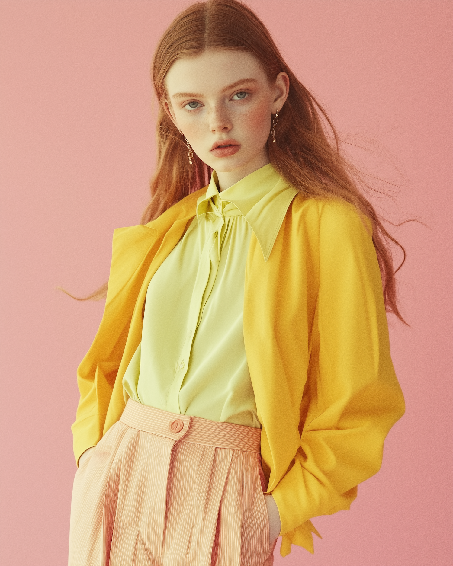 Stylish woman in a yellow blazer, lime blouse, and peach trousers against a pink backdrop. Modern pastel fashion with gold earrings.