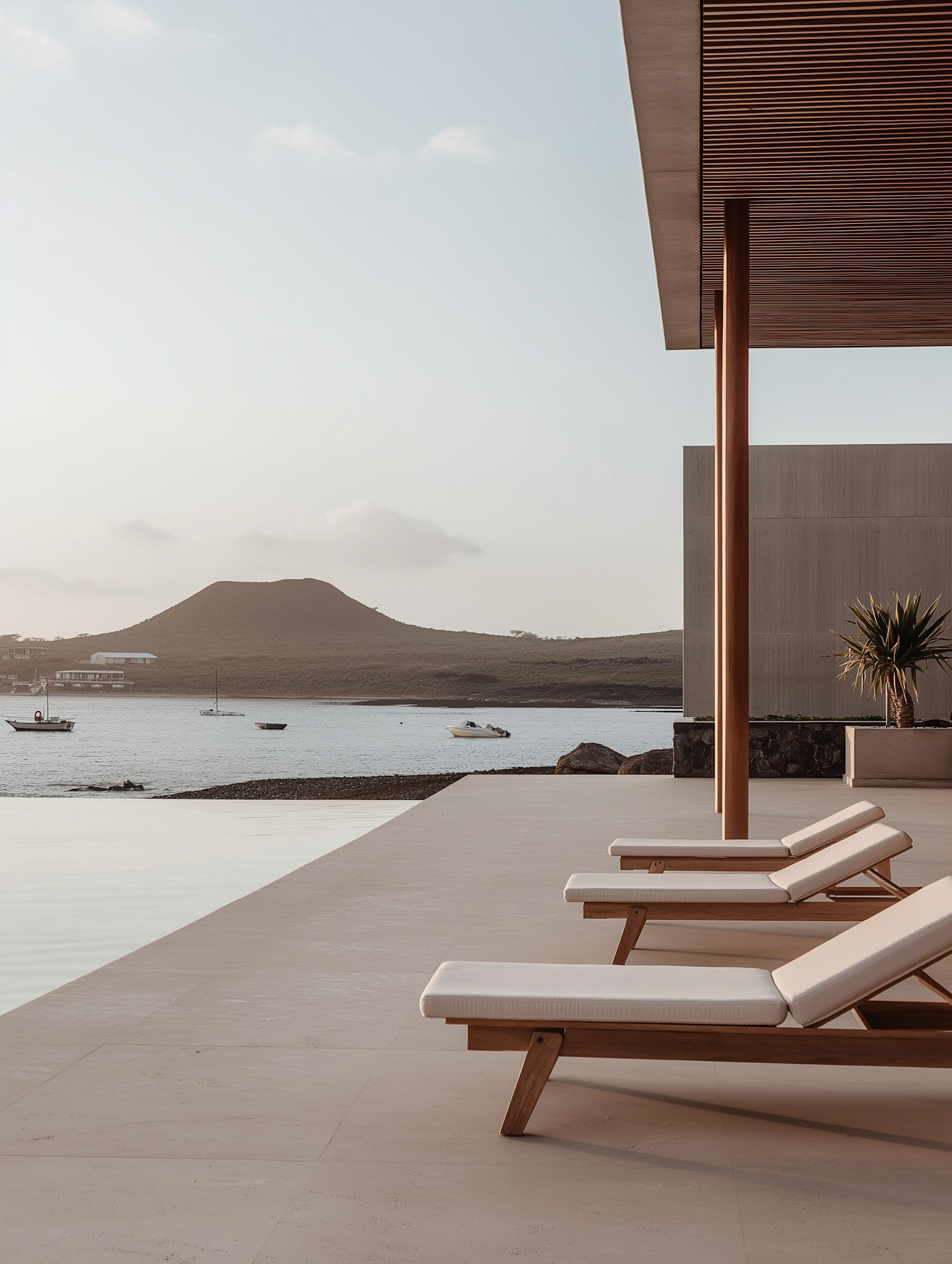 Minimalist patio with wooden lounge chairs, infinity pool, and serene bay view with boats and a hill in the background.