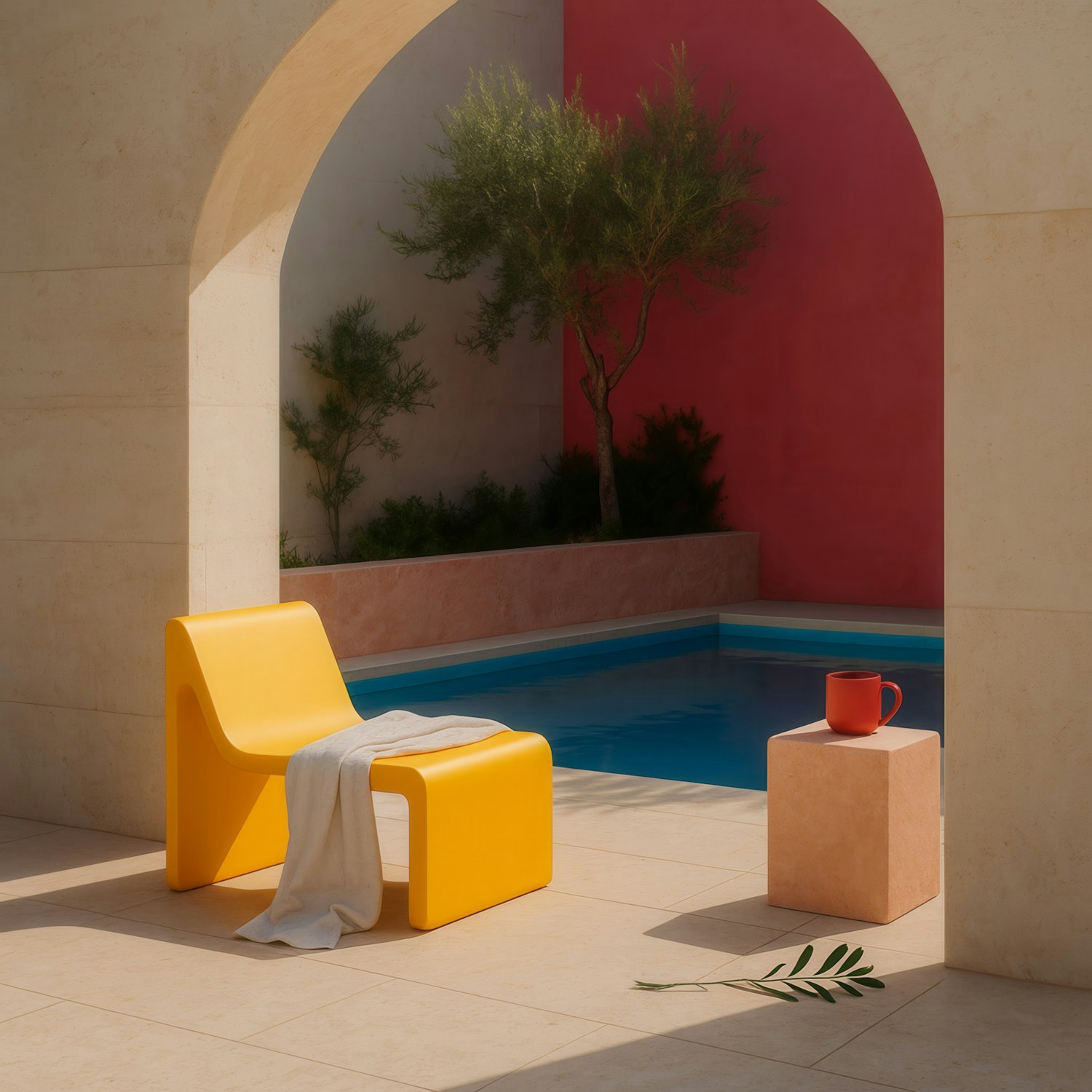 Minimalist patio with a yellow chair, red mug, and poolside vibes. Arched architecture, greenery, and bold colors create a serene retreat.