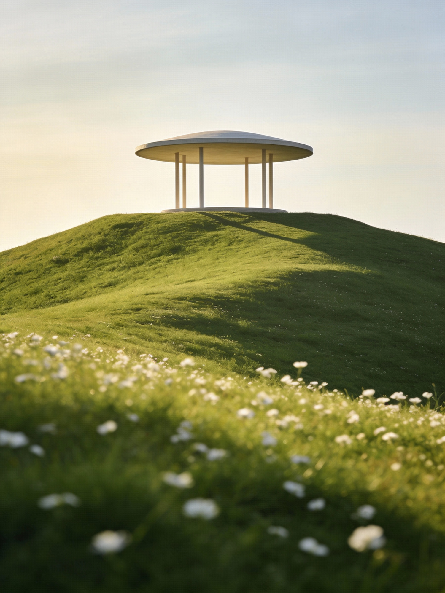 A minimalist modern gazebo standing alone on top of a gentle green hill, viewed from a distance; clean circular roof, slender supports, no decoration. Soft grass and tiny white flowers, natural warm light, clear sky, subtle atmospheric depth. Serene balanced composition emphasizing simplicity and scale. No road, no fence, no trees. Ultra detailed, cinematic lighting, 8k, realistic textures, minimal design aesthetic.