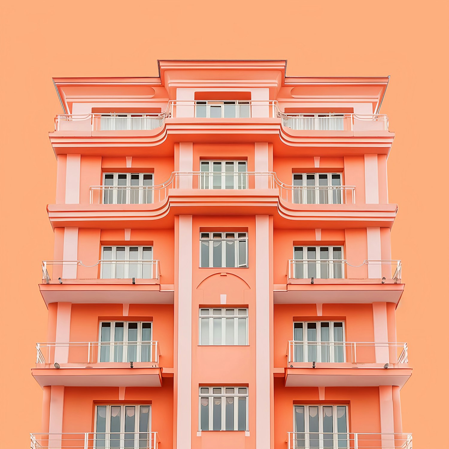 A peach-colored building with white railings and large windows stands against a matching background, creating a striking visual harmony.