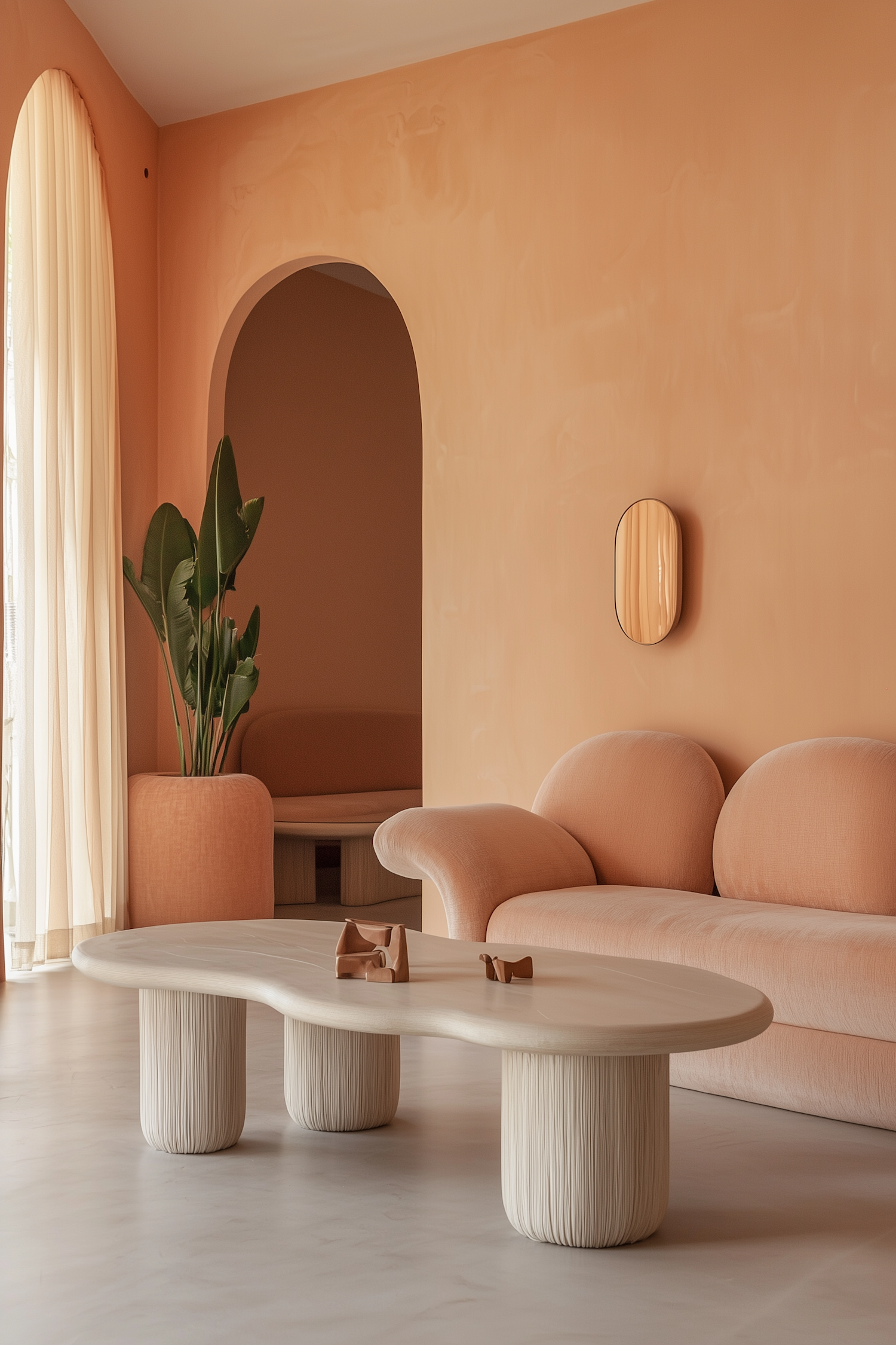 Warm peach-toned living room with a curved sofa, unique coffee table, lush plant, and arched accents for a cozy, modern vibe.