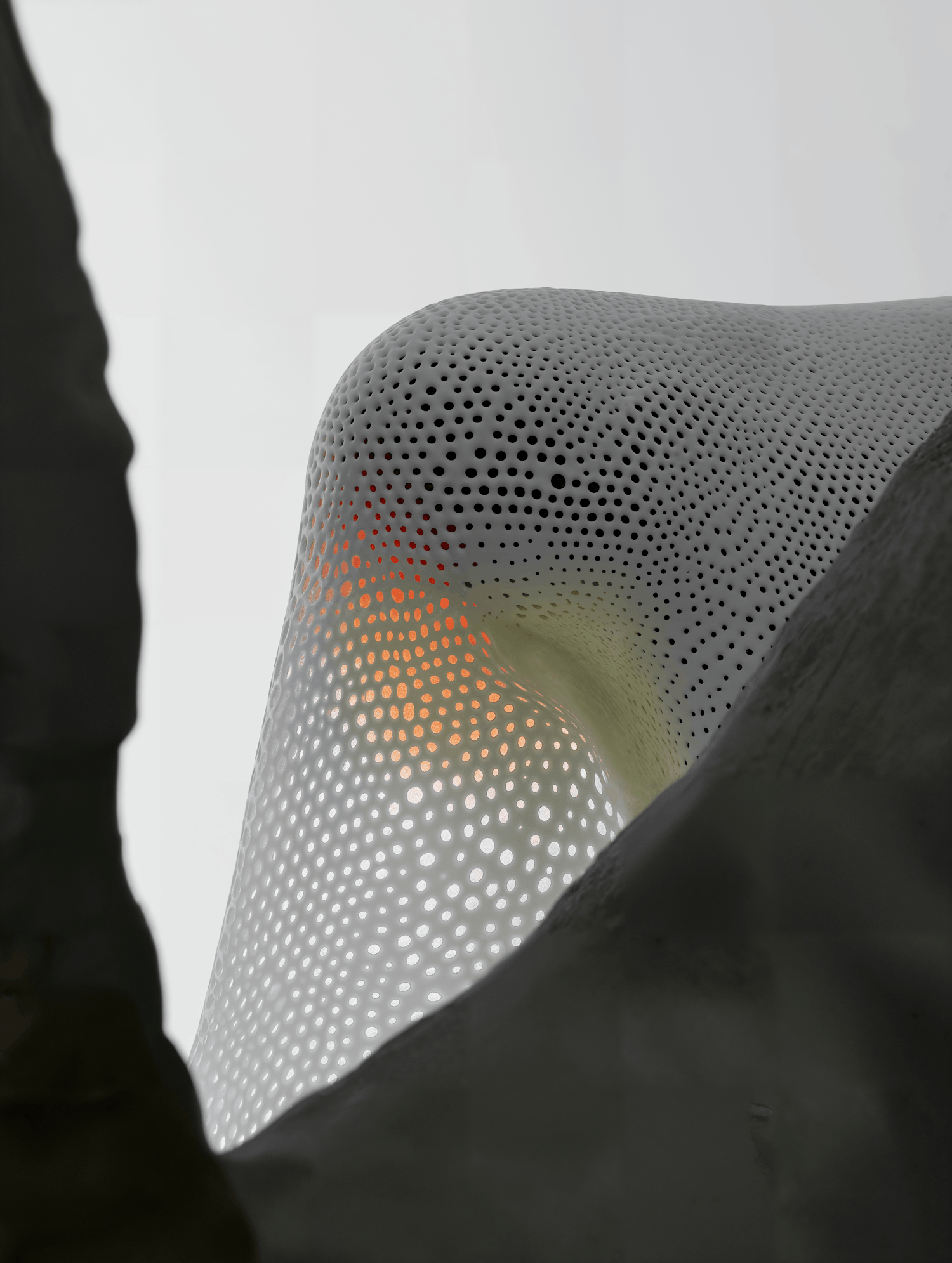 Close-up of a perforated white structure with warm orange light glowing through, framed by dark shapes for a modern, abstract aesthetic.