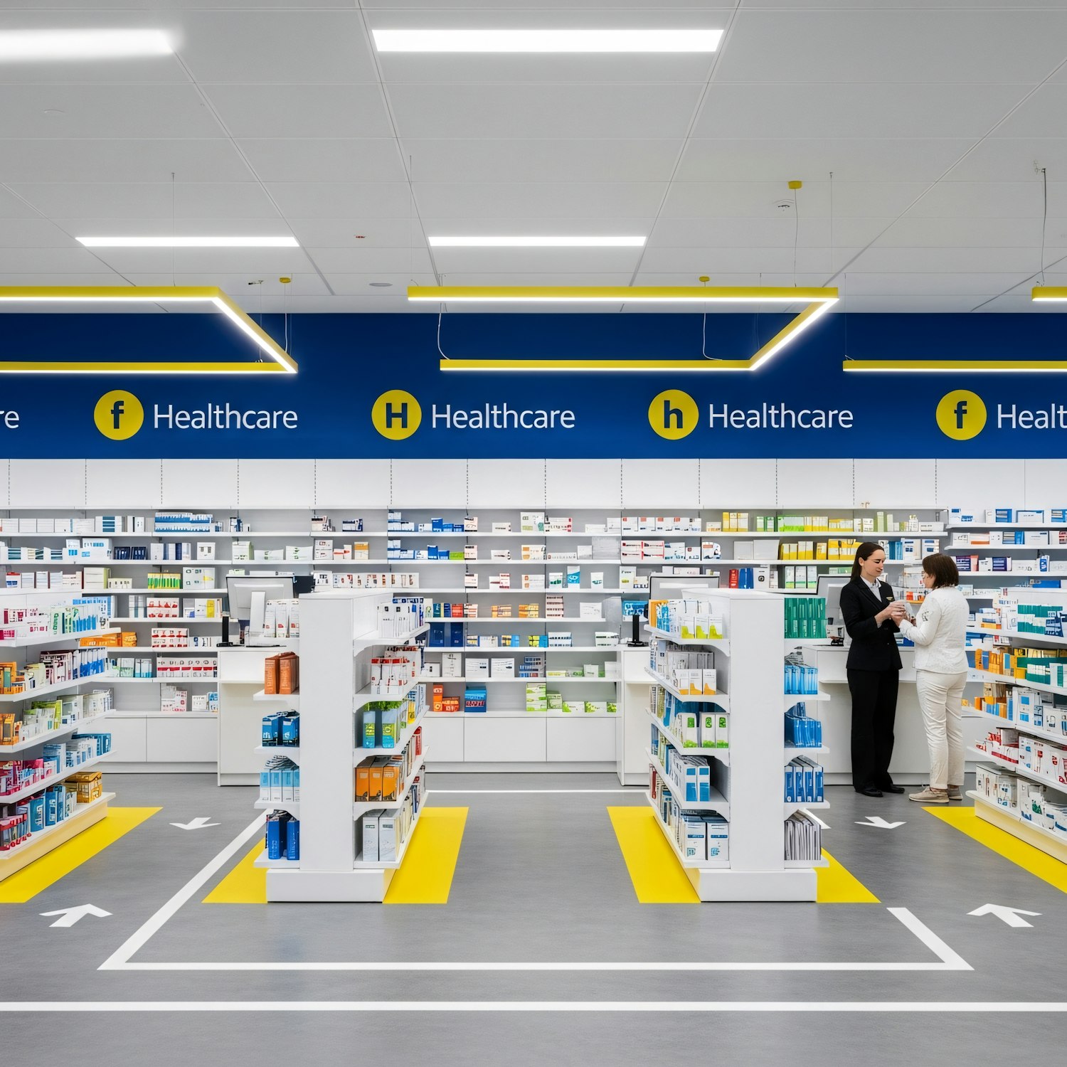 Bright and organized pharmacy interior with shelves of healthcare products and two people discussing near the counter area.