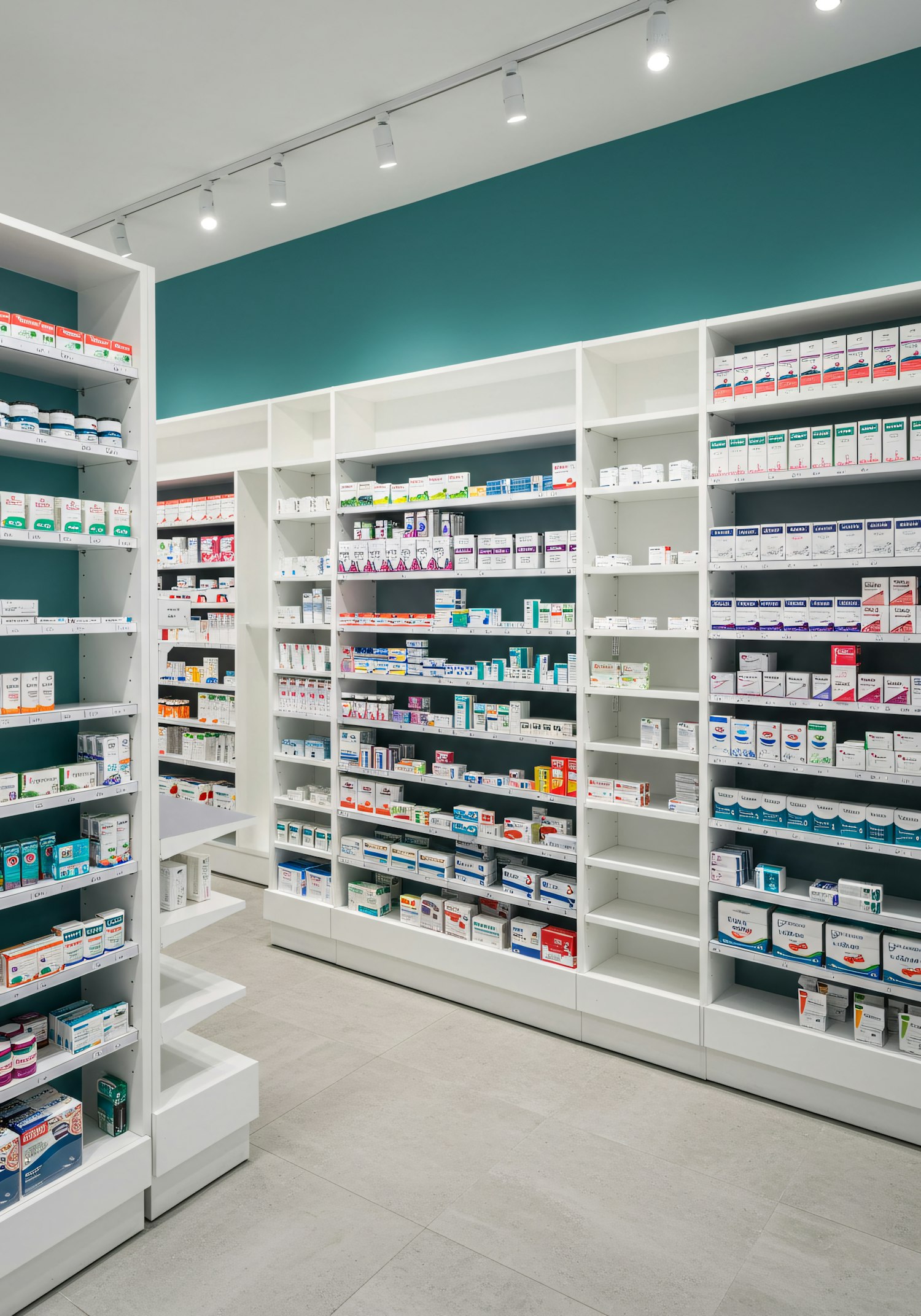 Bright and organized pharmacy interior with white shelves stocked with various medicines, teal walls, and modern lighting.