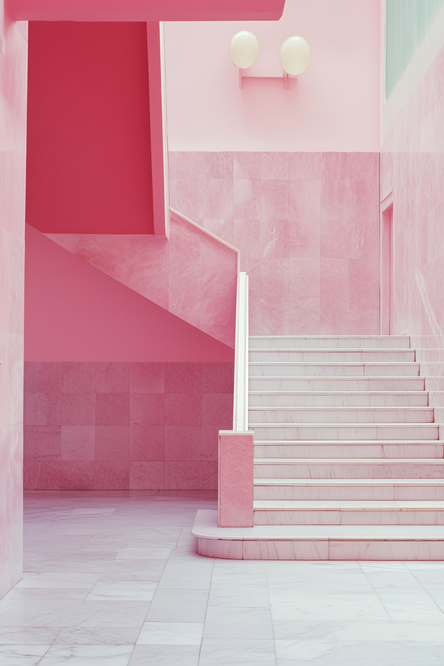 Modern pink interior with minimalist staircase and elegant lighting, creating a surreal and dreamy architectural scene.