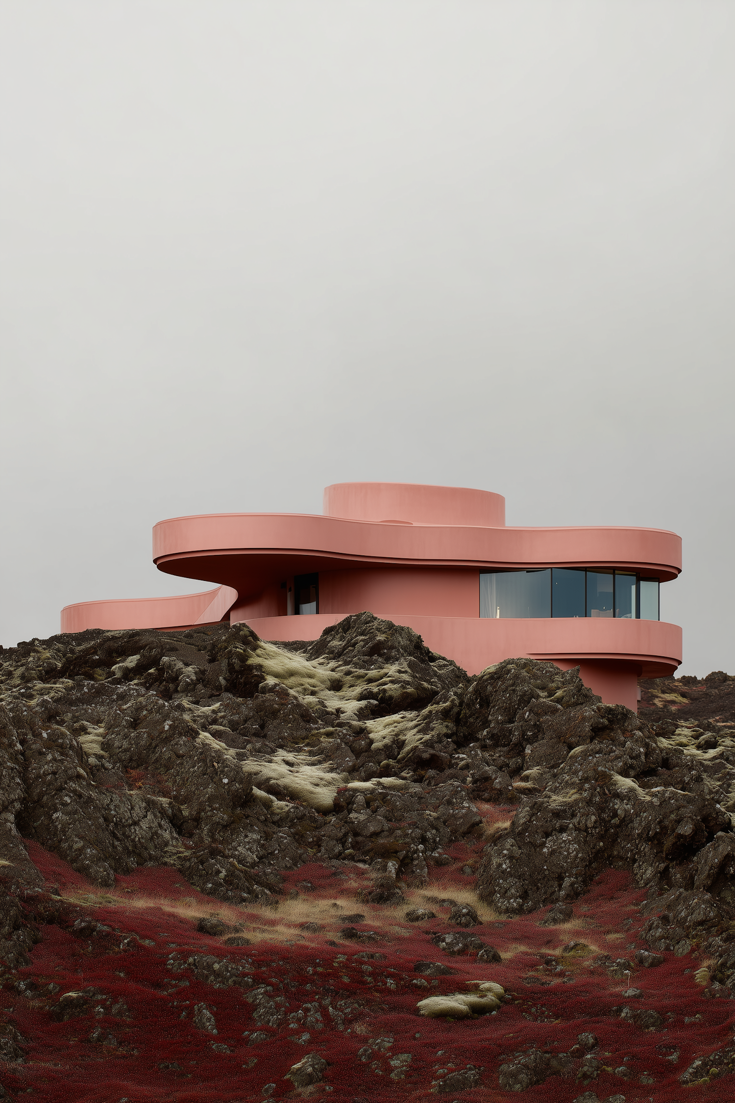 A modern pink building with curved windows sits atop a rocky, red and green landscape under an overcast sky.