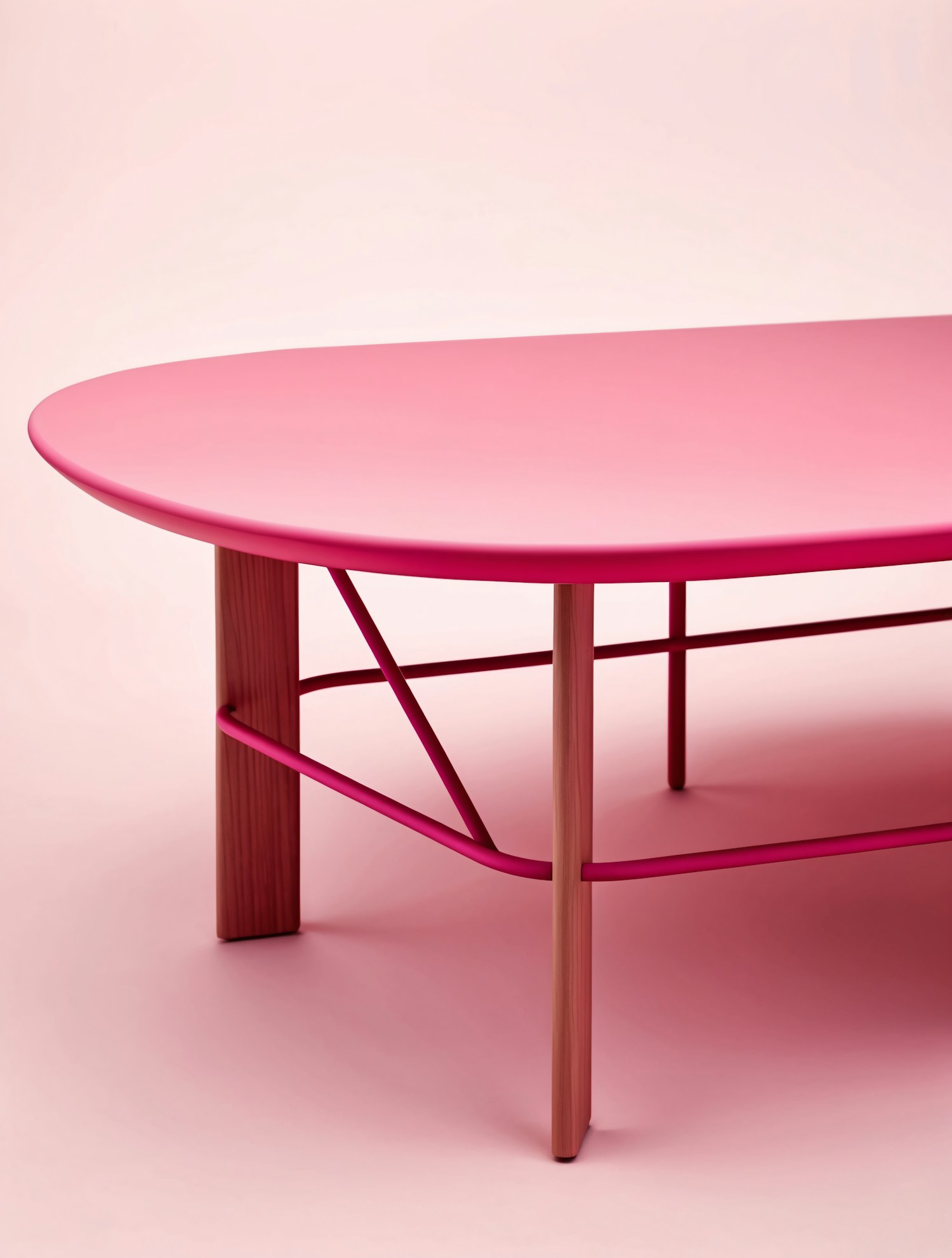 Sleek pink oval table with wooden legs and metal frame, set against a soft pink background. Perfect for modern interiors.