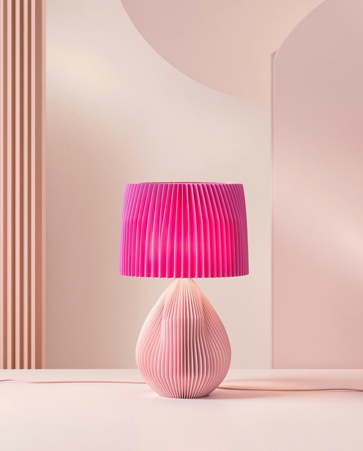 Stylish pink table lamp with a pleated design, set against a minimalist pink background with geometric accents.