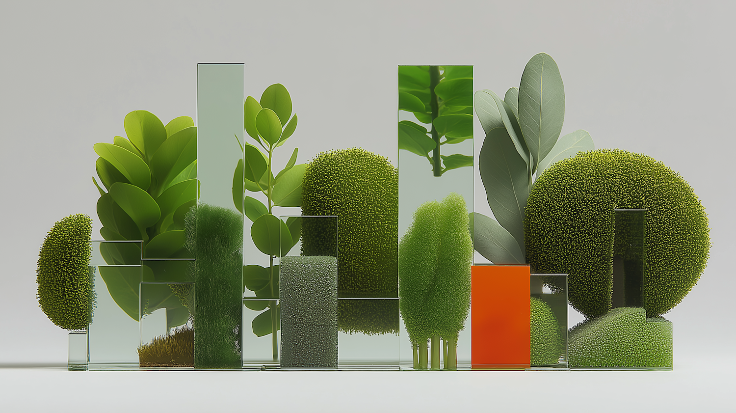 A modern arrangement of green plants and moss in glass containers with a striking orange accent, set against a clean white background.