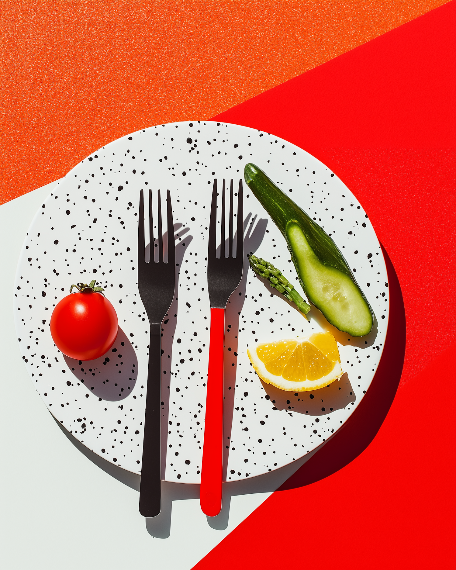 Artistic plate with speckled design, colorful veggies, and contrasting forks on a vibrant red-orange background.