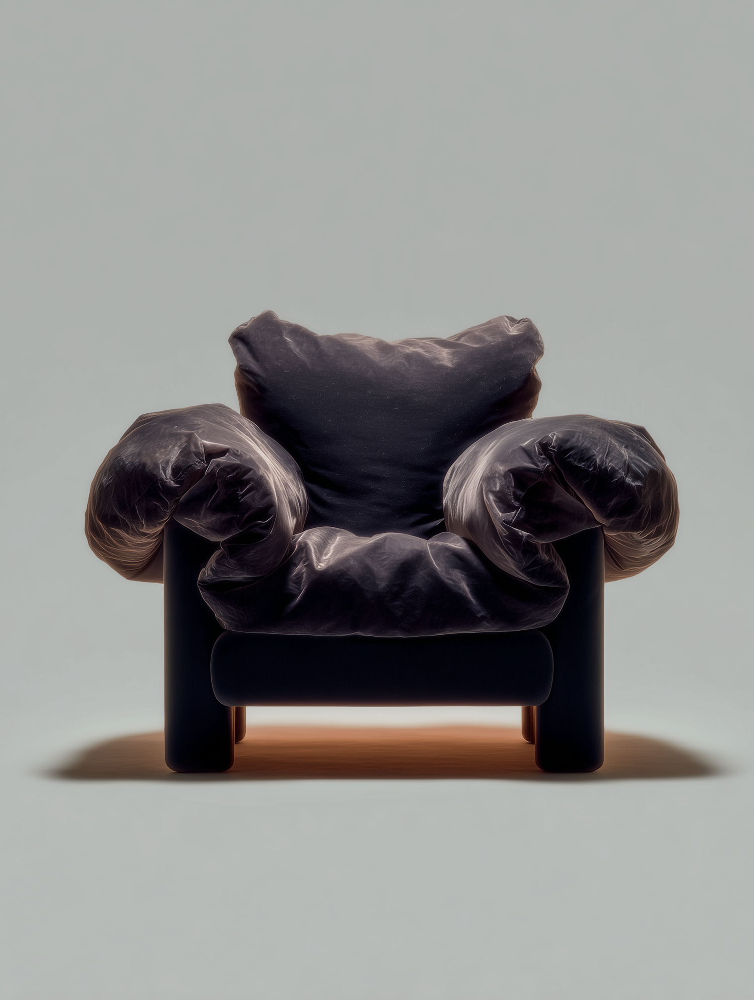 Modern armchair with oversized dark cushions and a sleek frame, perfect for a stylish and cozy living space.