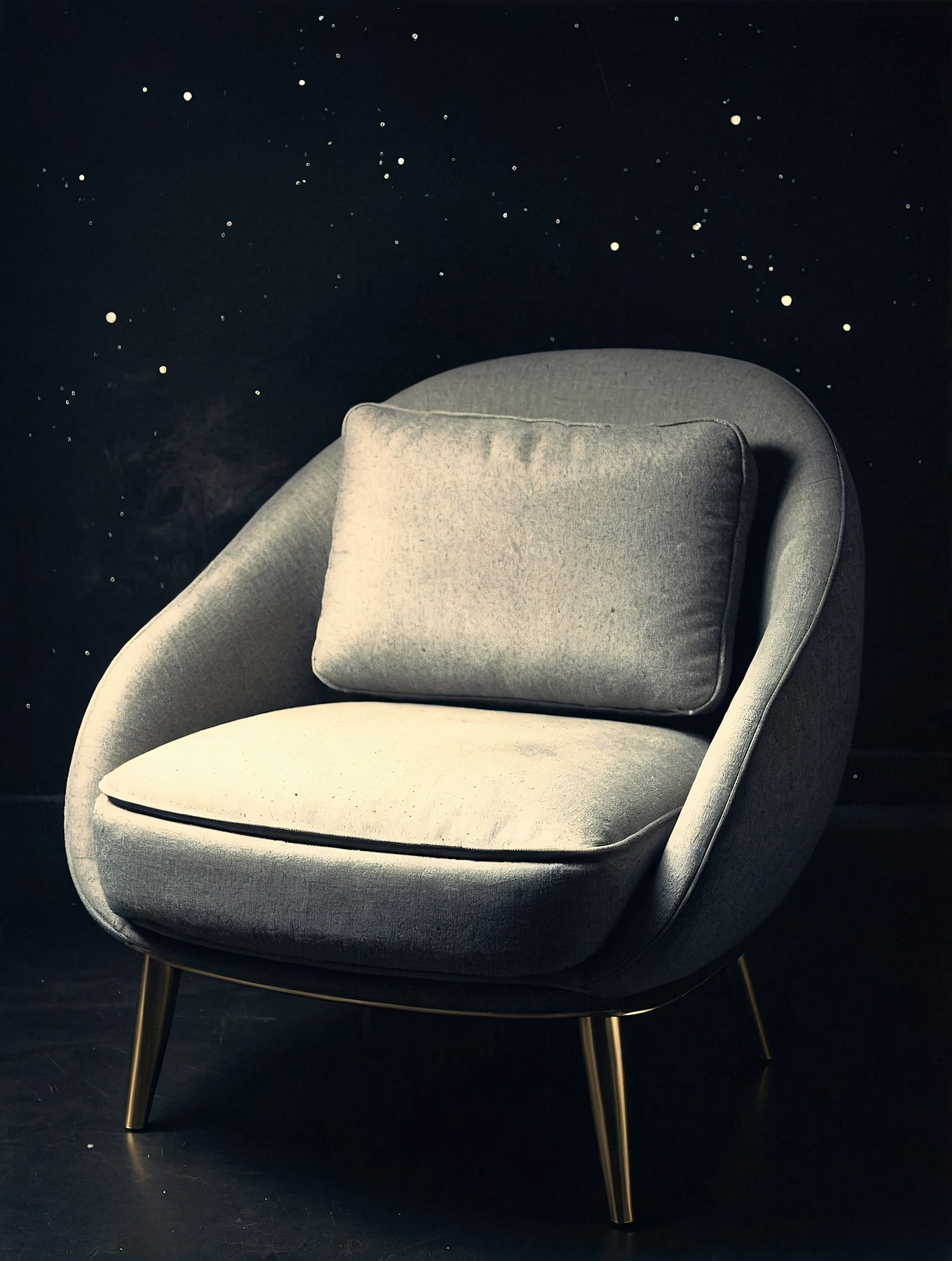 Modern gray armchair with golden legs against a starry night backdrop, blending comfort and elegance in a dramatic setting.