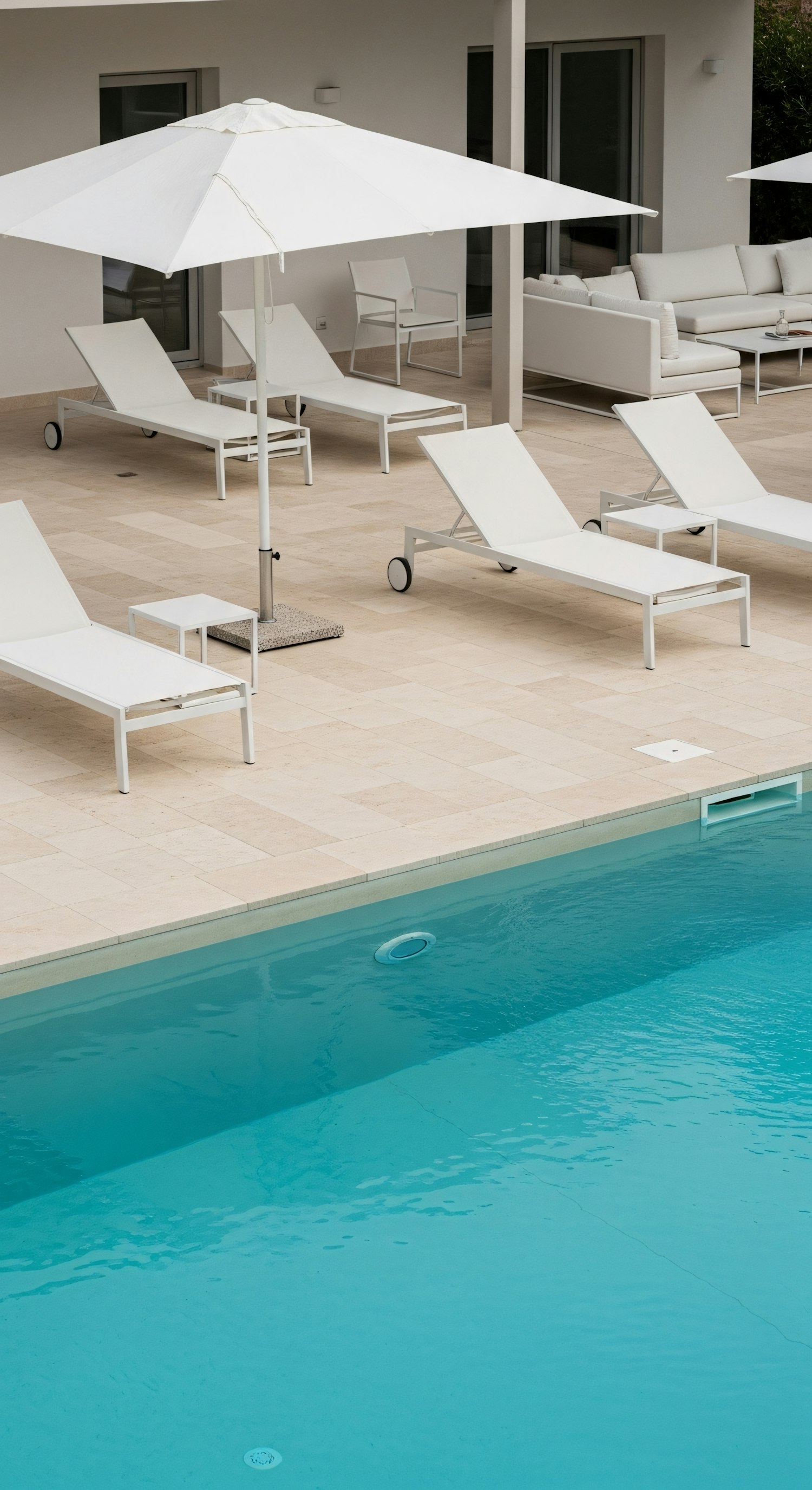 Modern poolside with white lounge chairs, umbrellas, and a clear blue pool, perfect for a relaxing outdoor retreat.