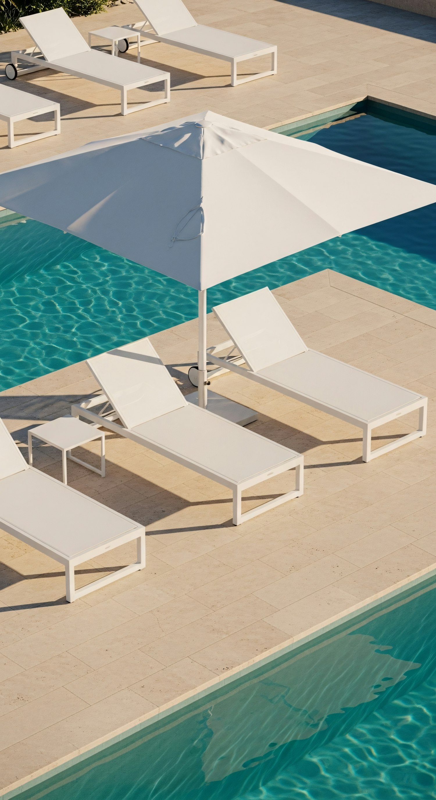 Modern white lounge chairs and umbrella by a turquoise pool on a beige tiled deck, perfect for a relaxing outdoor retreat.