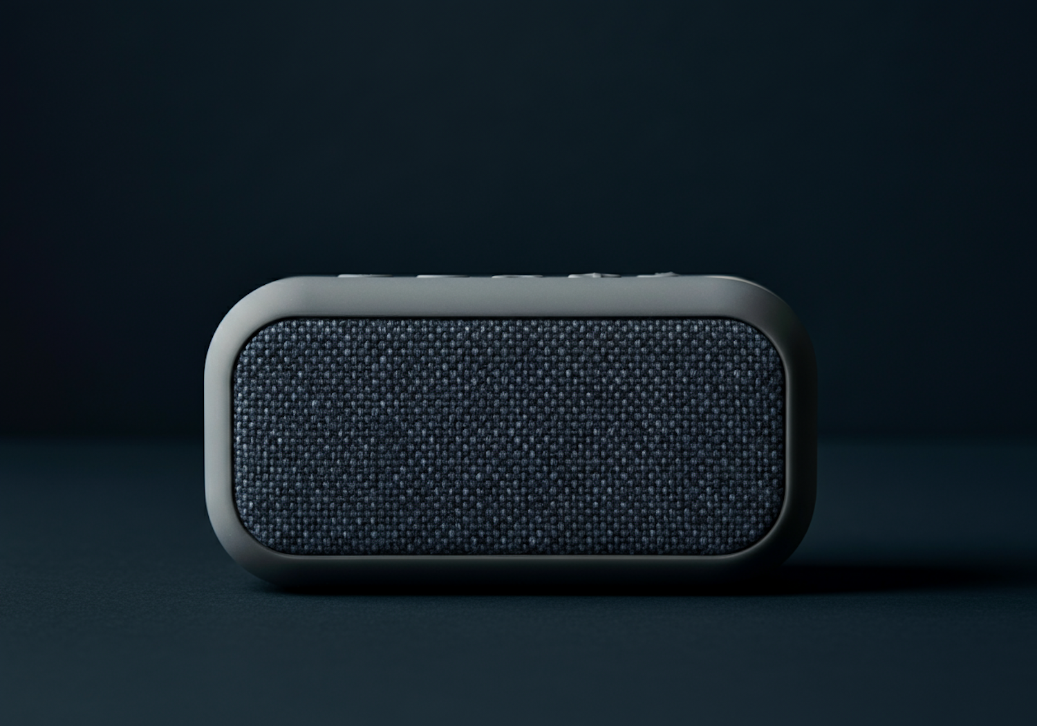 Minimalist portable speaker with a dark gray fabric front and rounded edges, set against a sleek dark background.