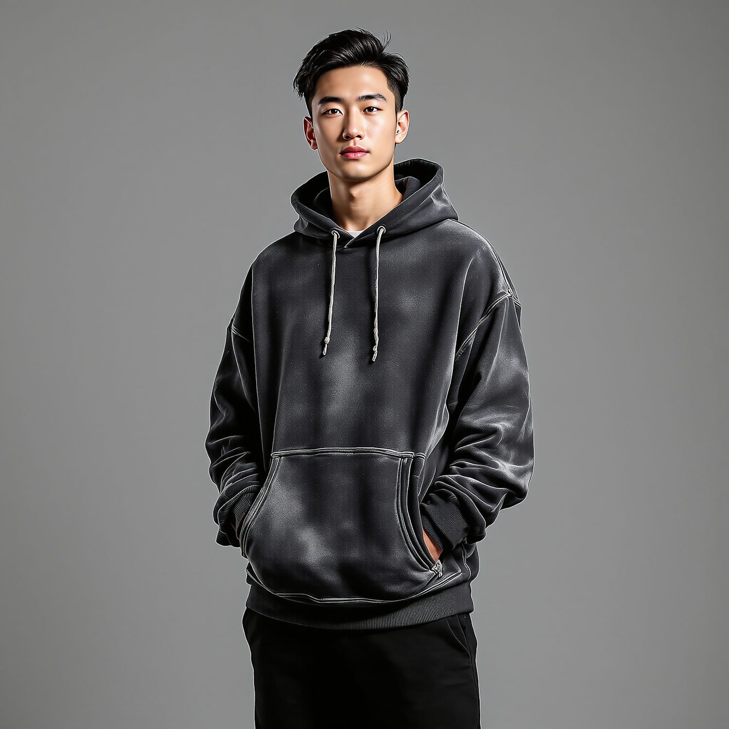 A young man in a dark gray hoodie stands against a neutral background, exuding a modern and minimalistic vibe.