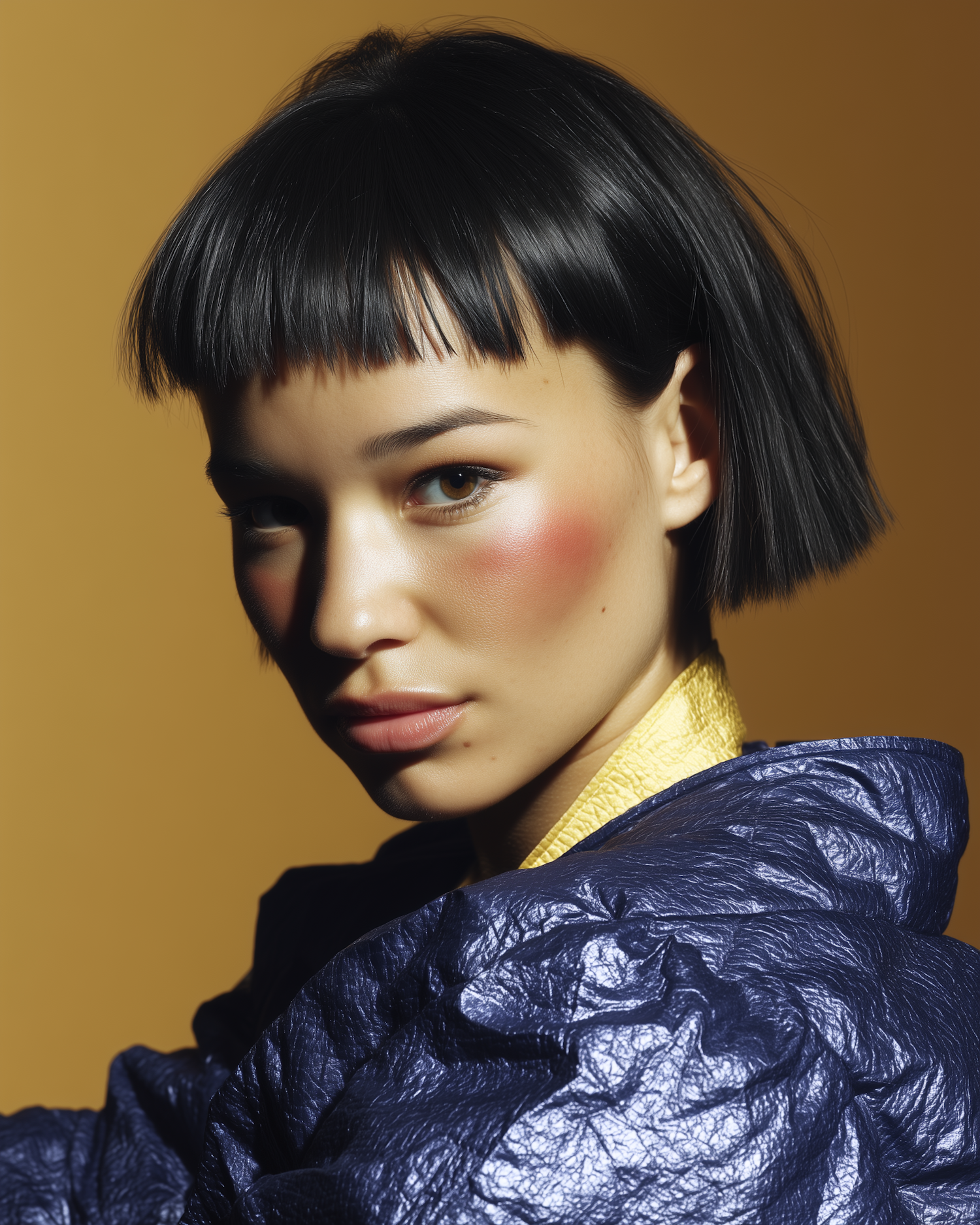 Close-up of a woman with sleek black bob, bold blush, and a shiny blue jacket against a mustard yellow background.