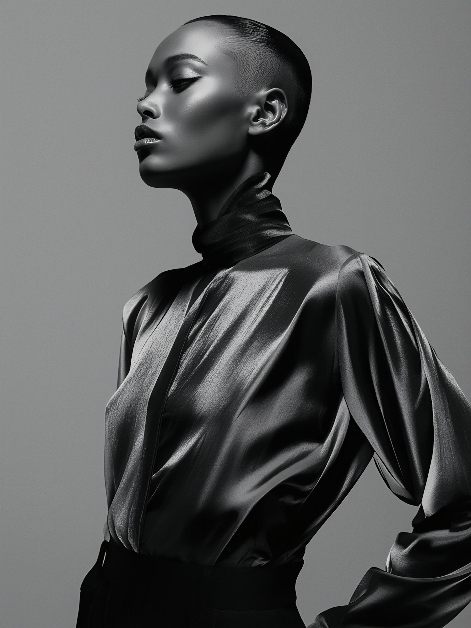 A sleek portrait of a person in a metallic-textured top, showcasing modern elegance with dramatic lighting and a neutral background.