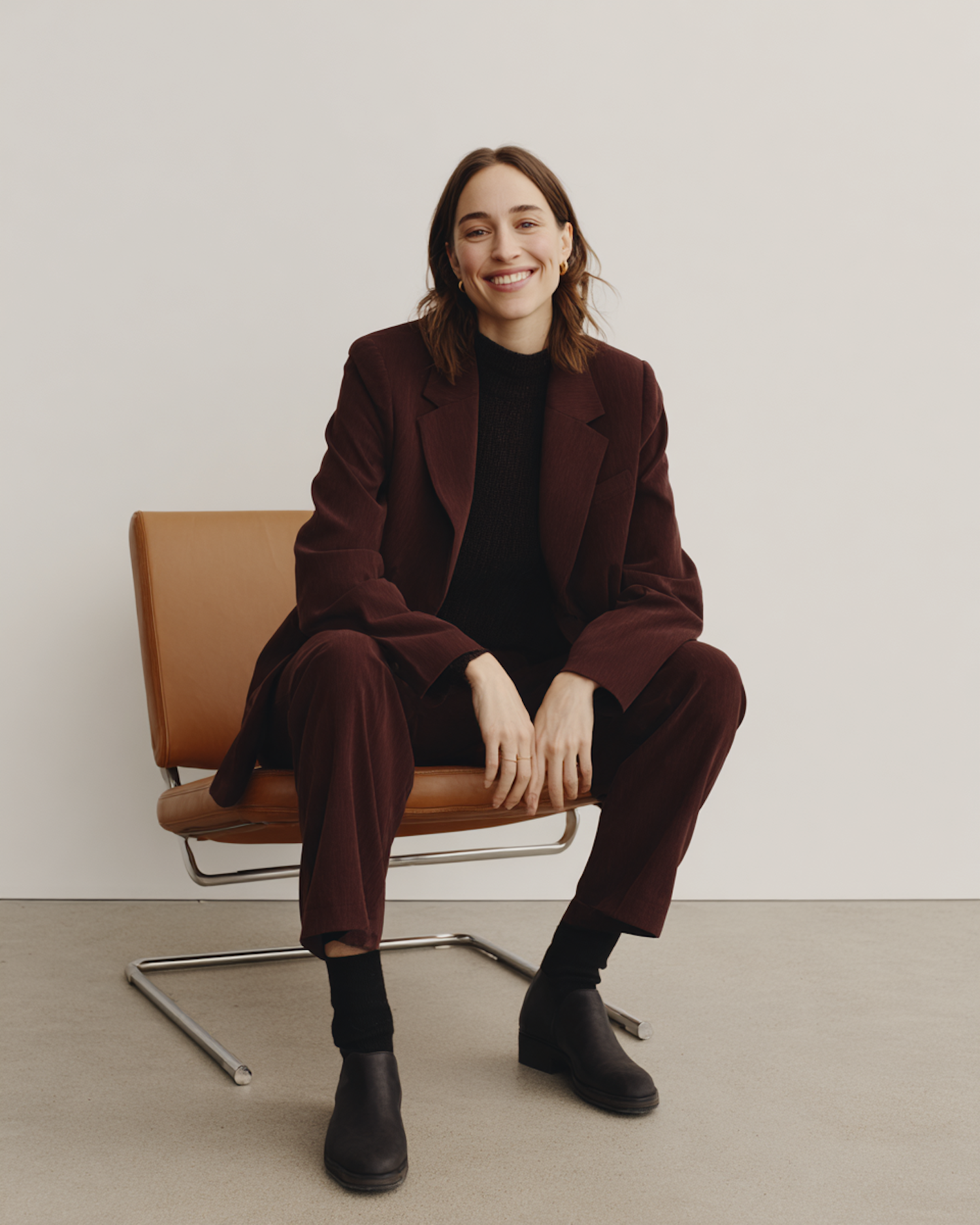 A person in a burgundy suit sits on a modern chair against a neutral background, exuding a relaxed and professional vibe.