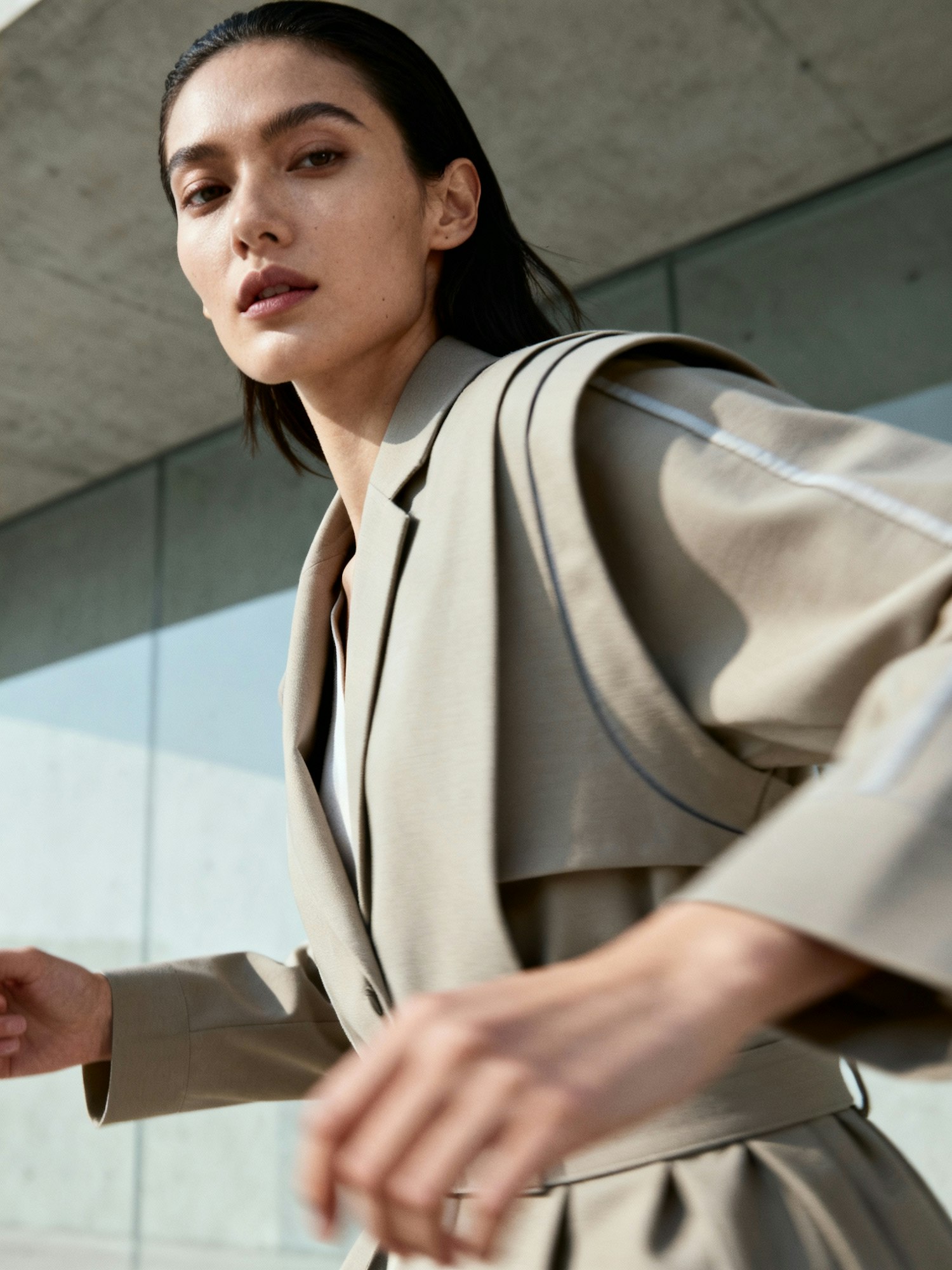A high-fashion, contemporary photo of a female model in motion, dynamic pose, minimalist urban background, edgy and modern styling, clean lines, natural lighting with subtle shadows, inspired by COS and Acne Studios editorial aesthetic. Realistic photography, stylish and sophisticated mood.