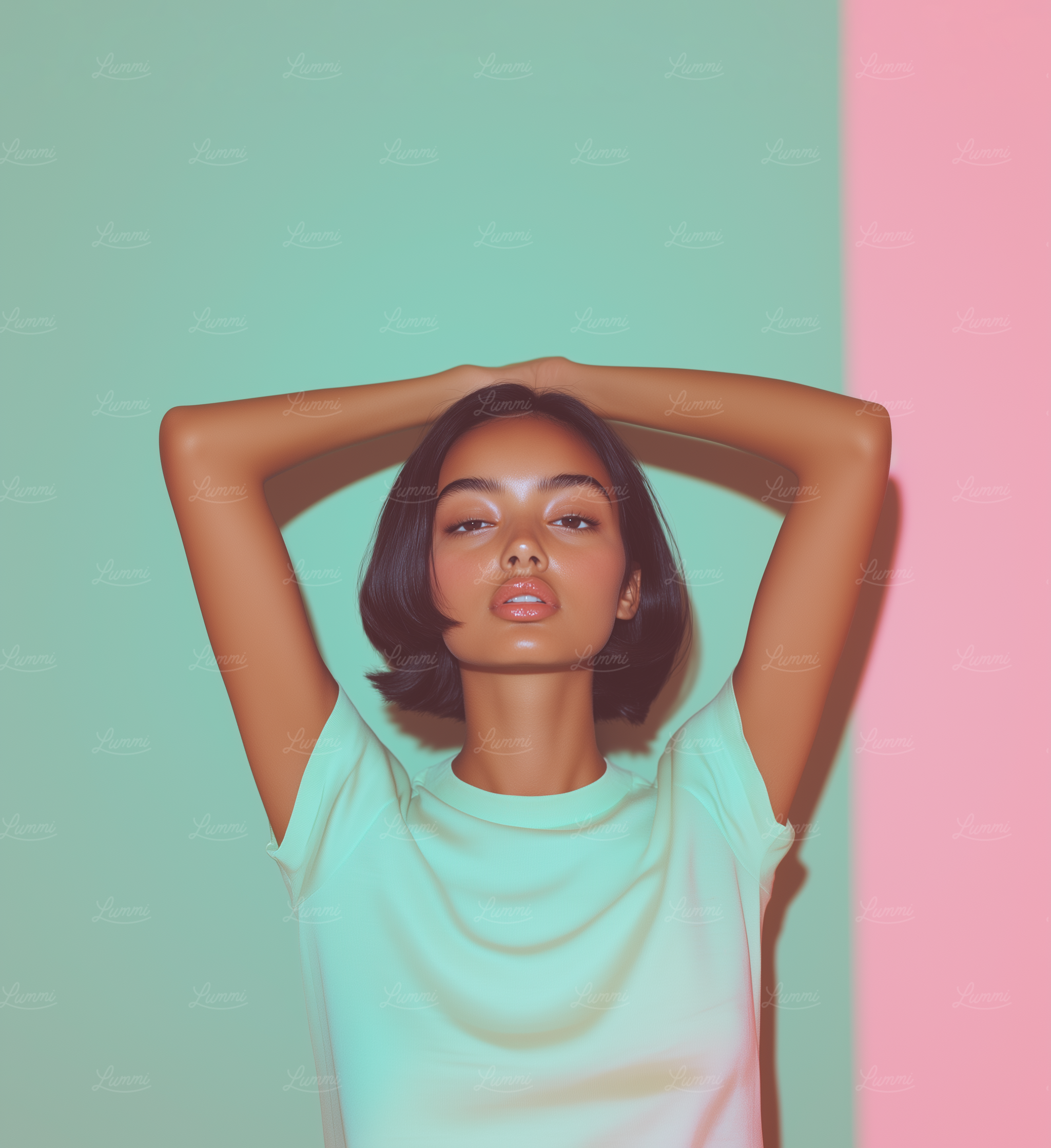 Stylish portrait of a woman in a mint green t-shirt, posing with arms raised against a vibrant mint and pink background.
