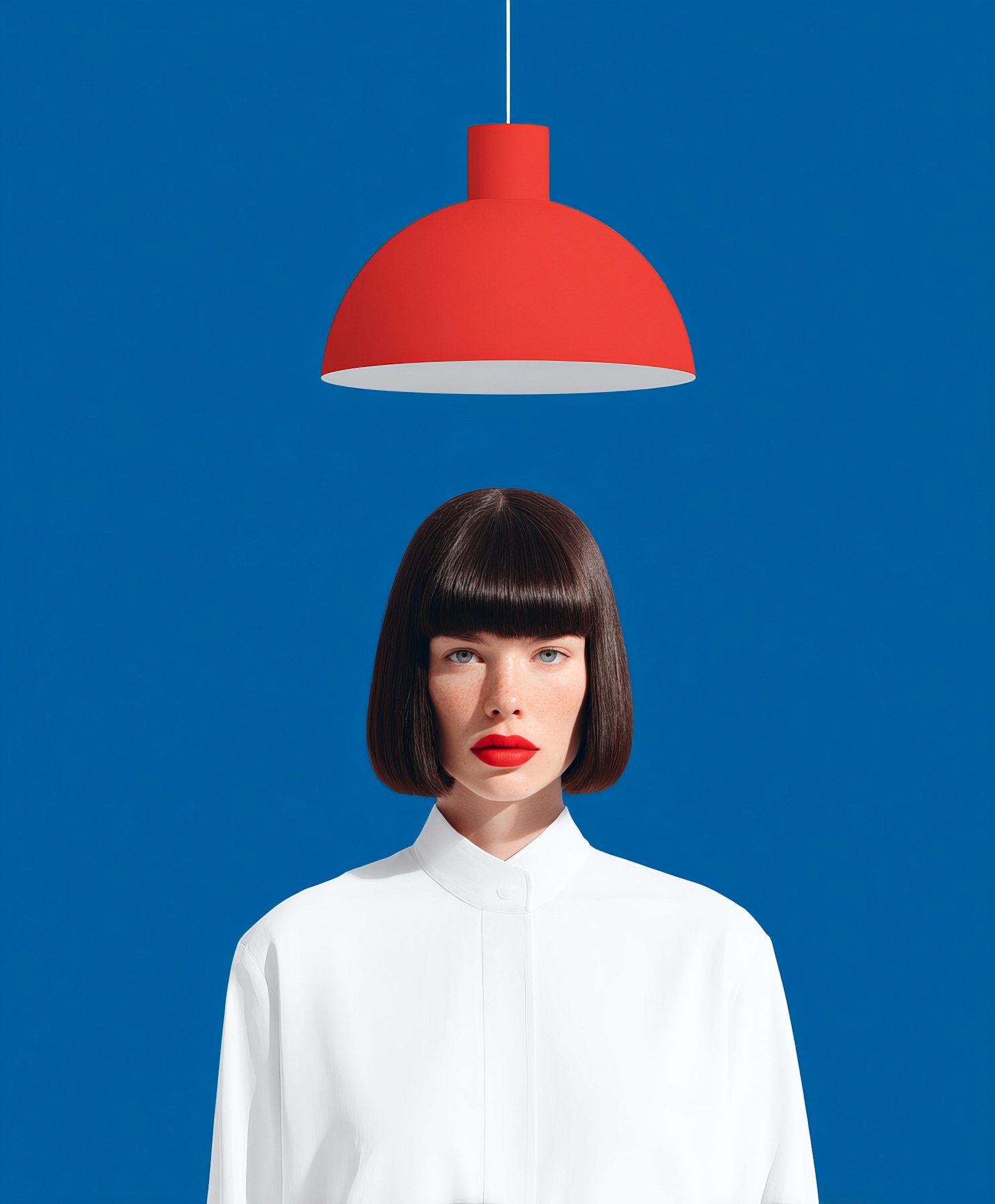 A striking portrait of a woman in a white shirt with a red lamp above, set against a vibrant blue background.