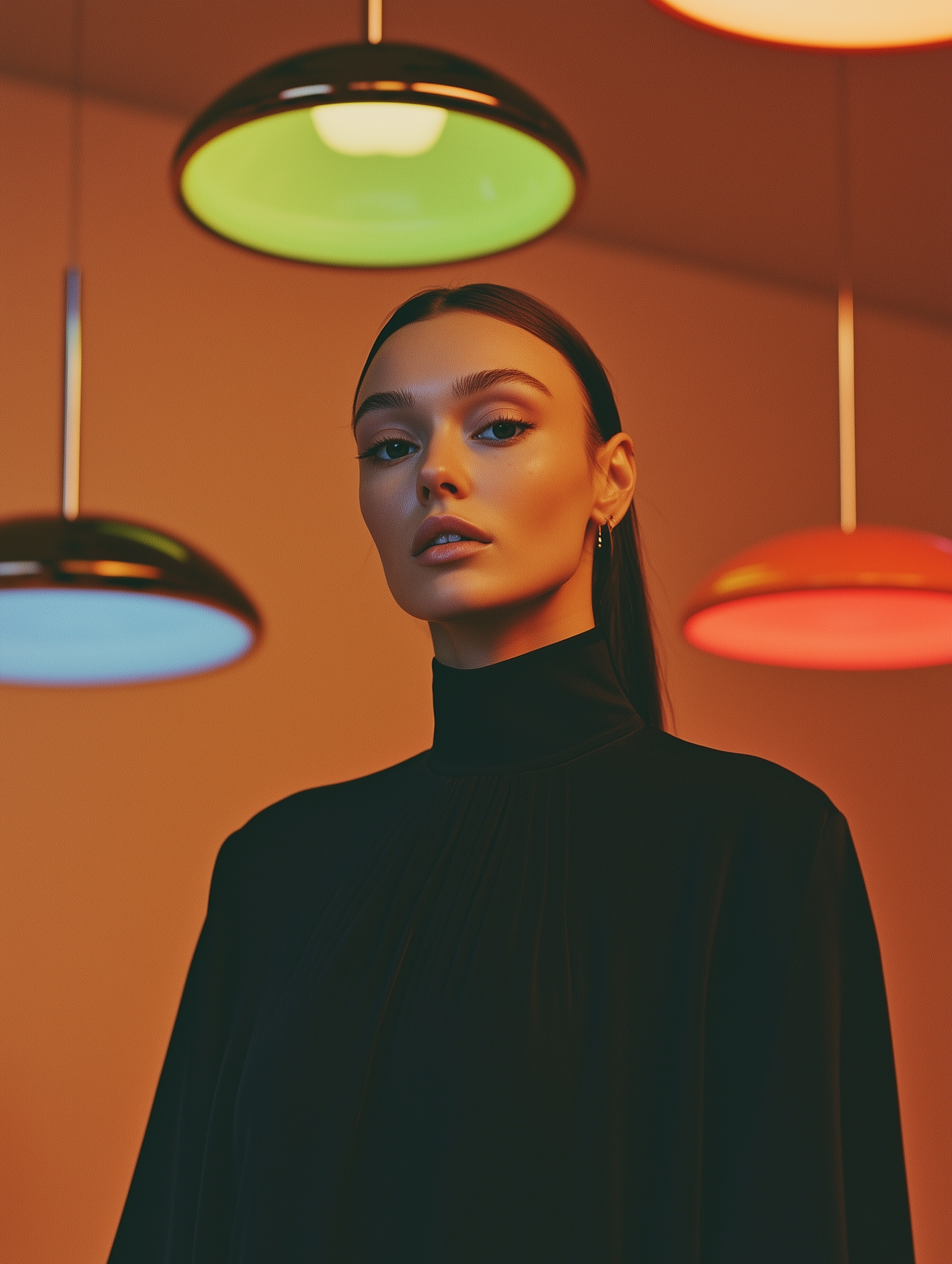 A stylish portrait of a woman in a black outfit under colorful pendant lights, creating a modern and artistic vibe.