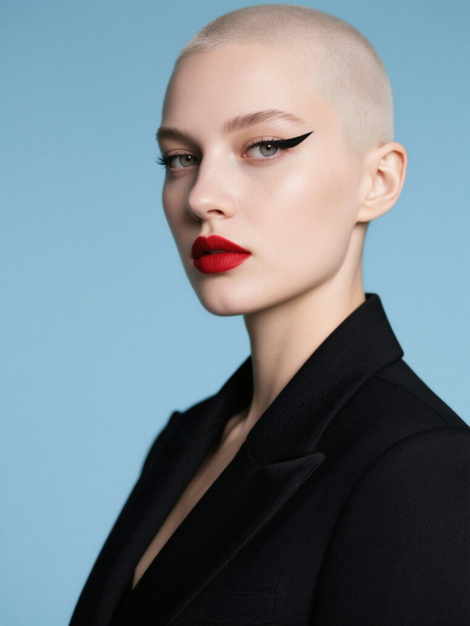 An ultra-realistic, photorealistic, and highly detailed close-up portrait of a female model with a shaved head, very pale skin, bold red lipstick, and dramatic black winged eyeliner. She is wearing a sharp black blazer and is posed against a solid, light blue background. The image should be in sharp focus with professional studio lighting, showcasing every detail. High definition, 8K, high contrast