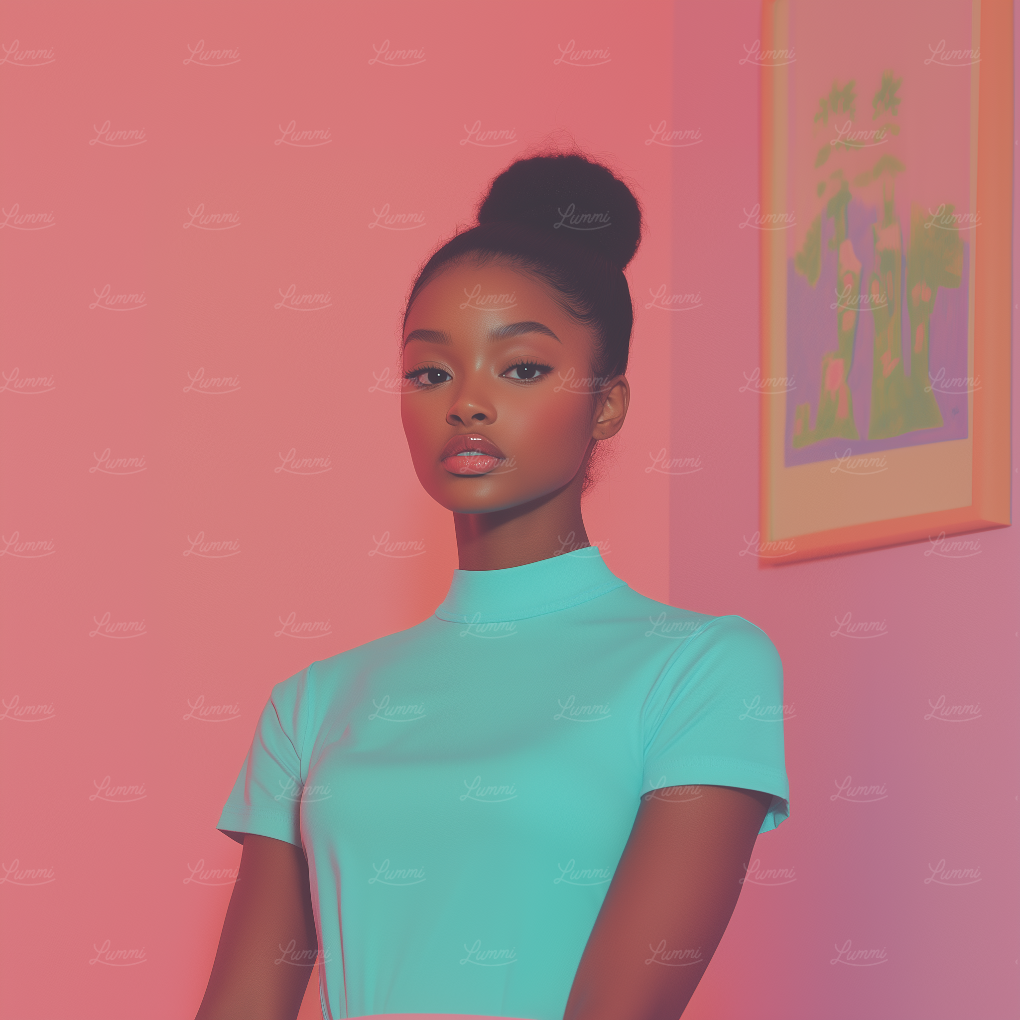 A young woman in a turquoise top stands against a pink background with a framed abstract artwork, creating a vibrant and modern aesthetic.