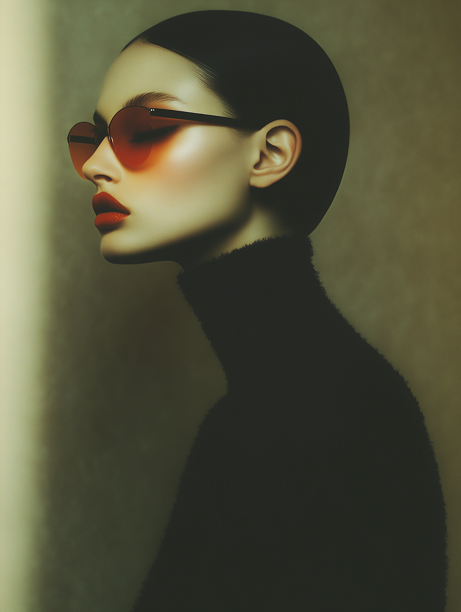 Elegant woman in red sunglasses and black attire, showcasing modern style and sophistication.