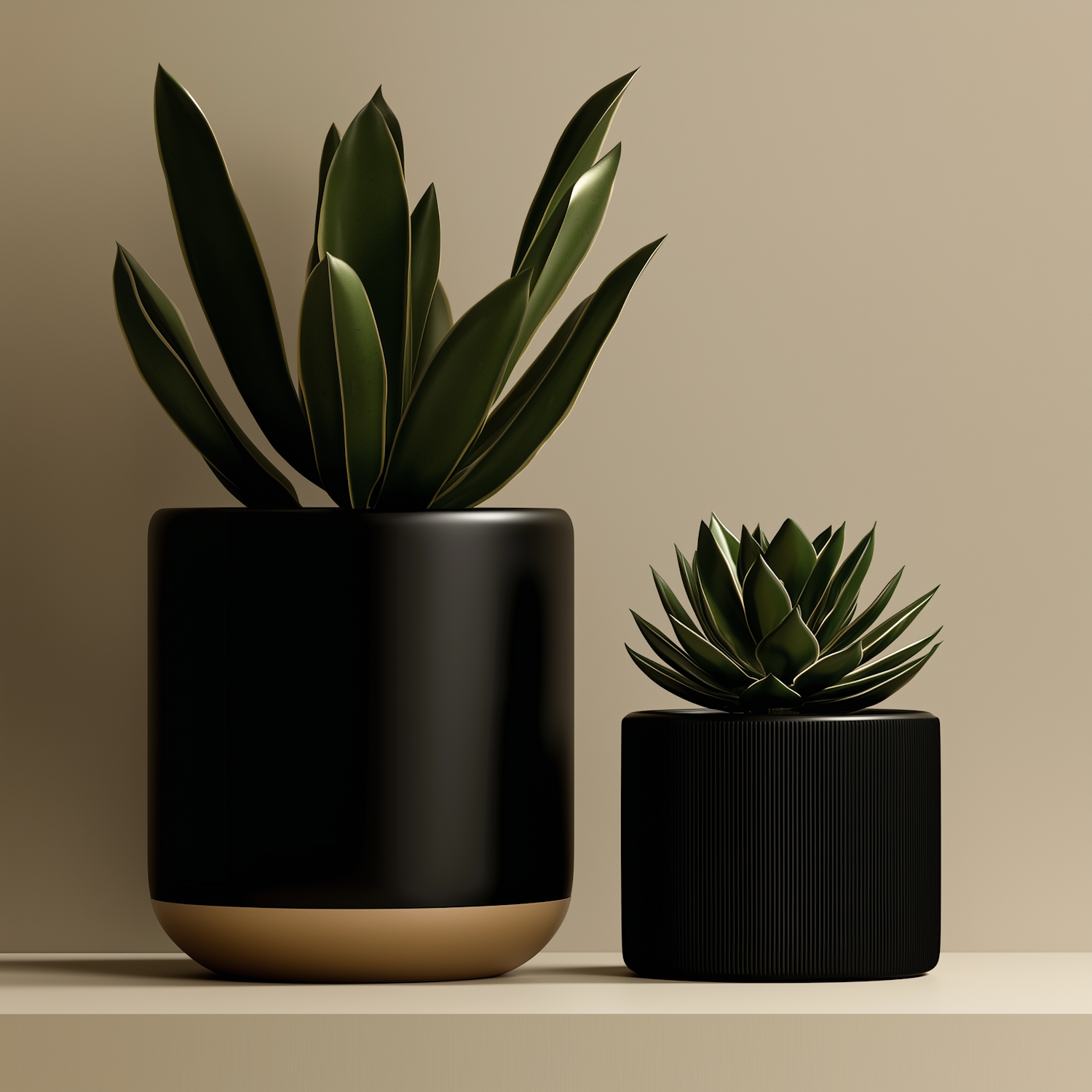 Minimalist arrangement of two potted plants in sleek black pots against a beige background, showcasing modern design and natural beauty.