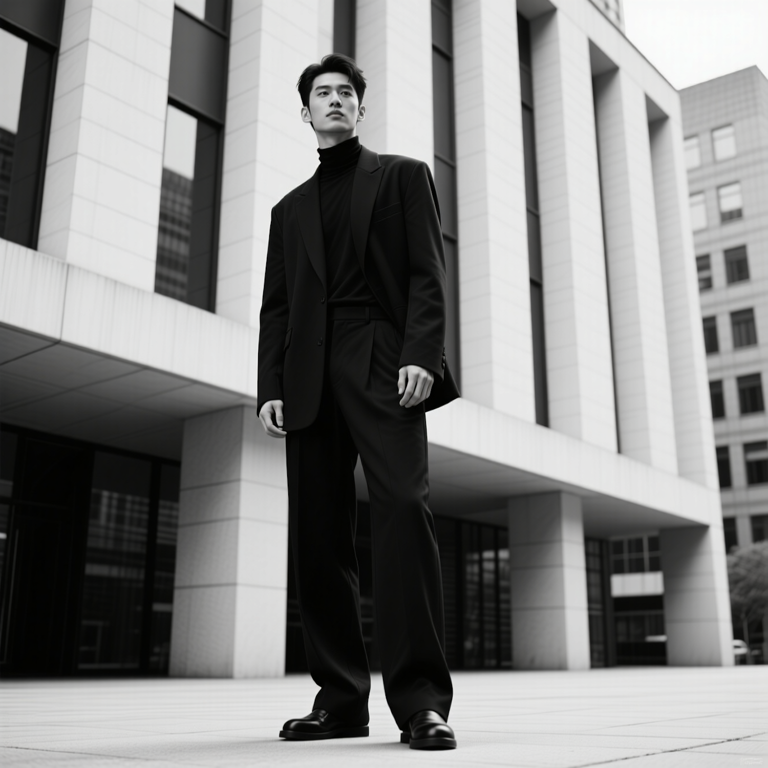 A man in a black suit stands confidently in front of a modern building, showcasing a sleek and professional style in a monochromatic setting.