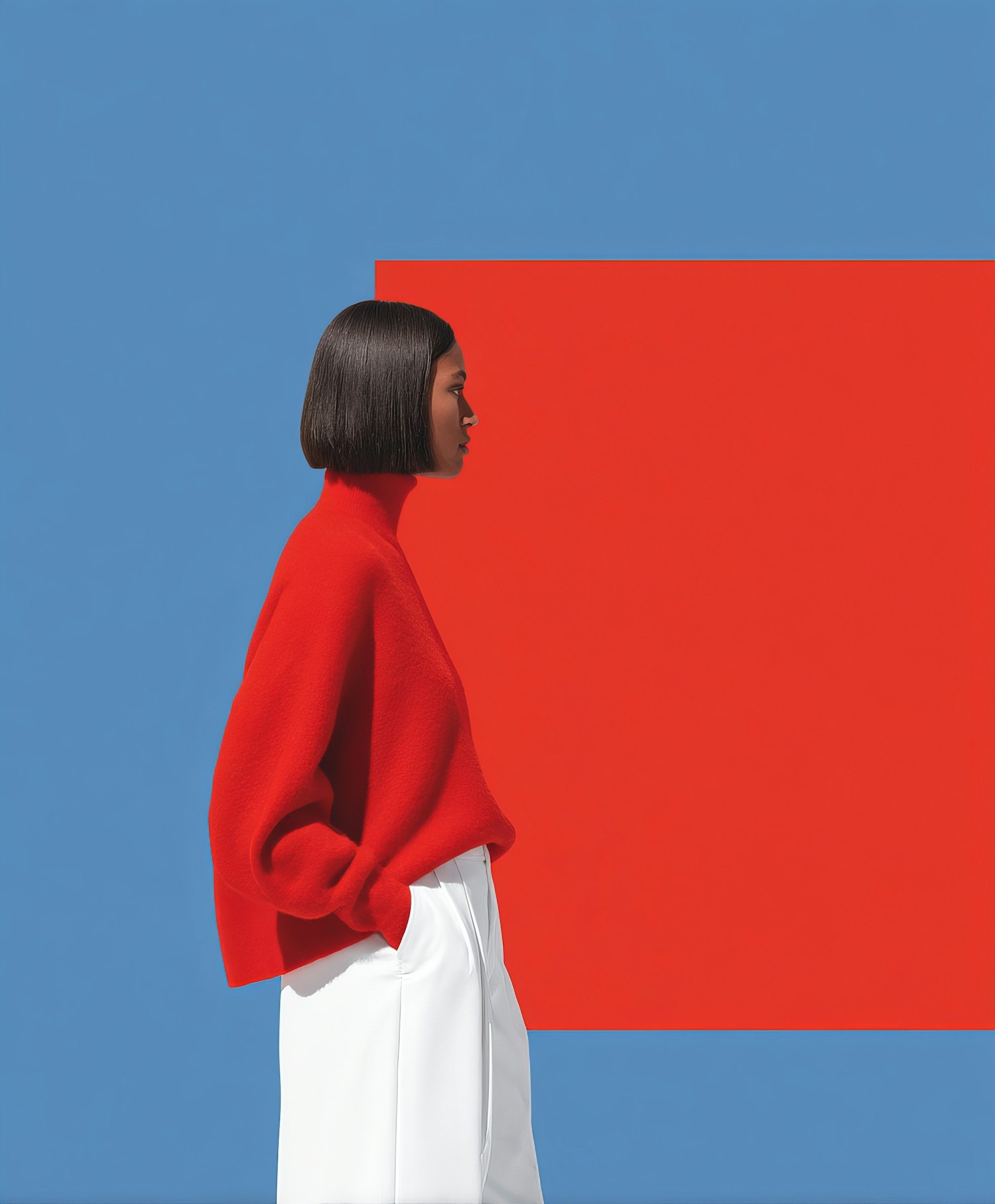A stylish individual in a red sweater and white trousers stands against a bold blue and red minimalist background.
