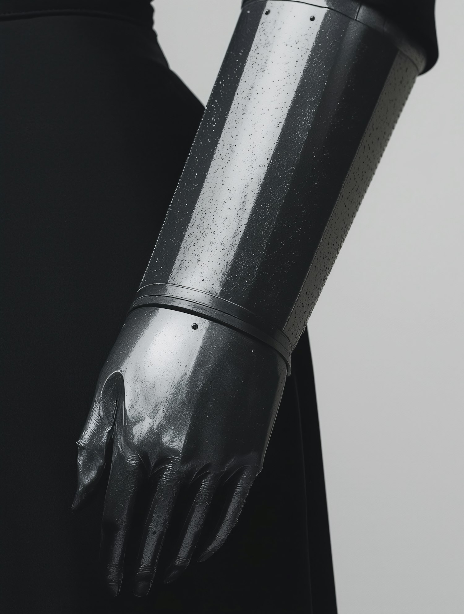 Close-up of a sleek black prosthetic arm with a glossy finish, showcasing modern design and advanced technology.