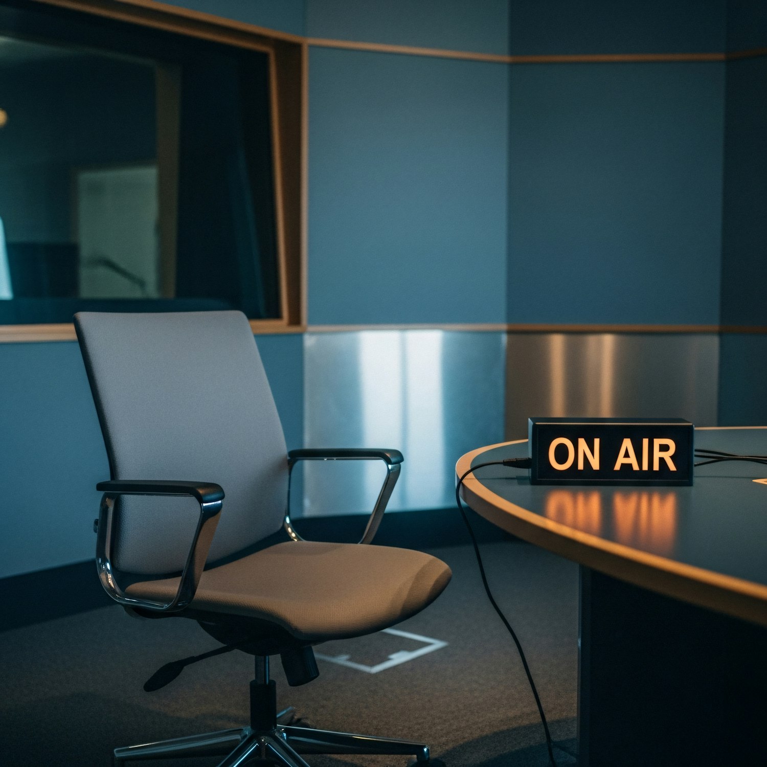 A sleek radio studio with a lit 'ON AIR' sign on a table, a gray office chair, and soundproofed walls in the background.