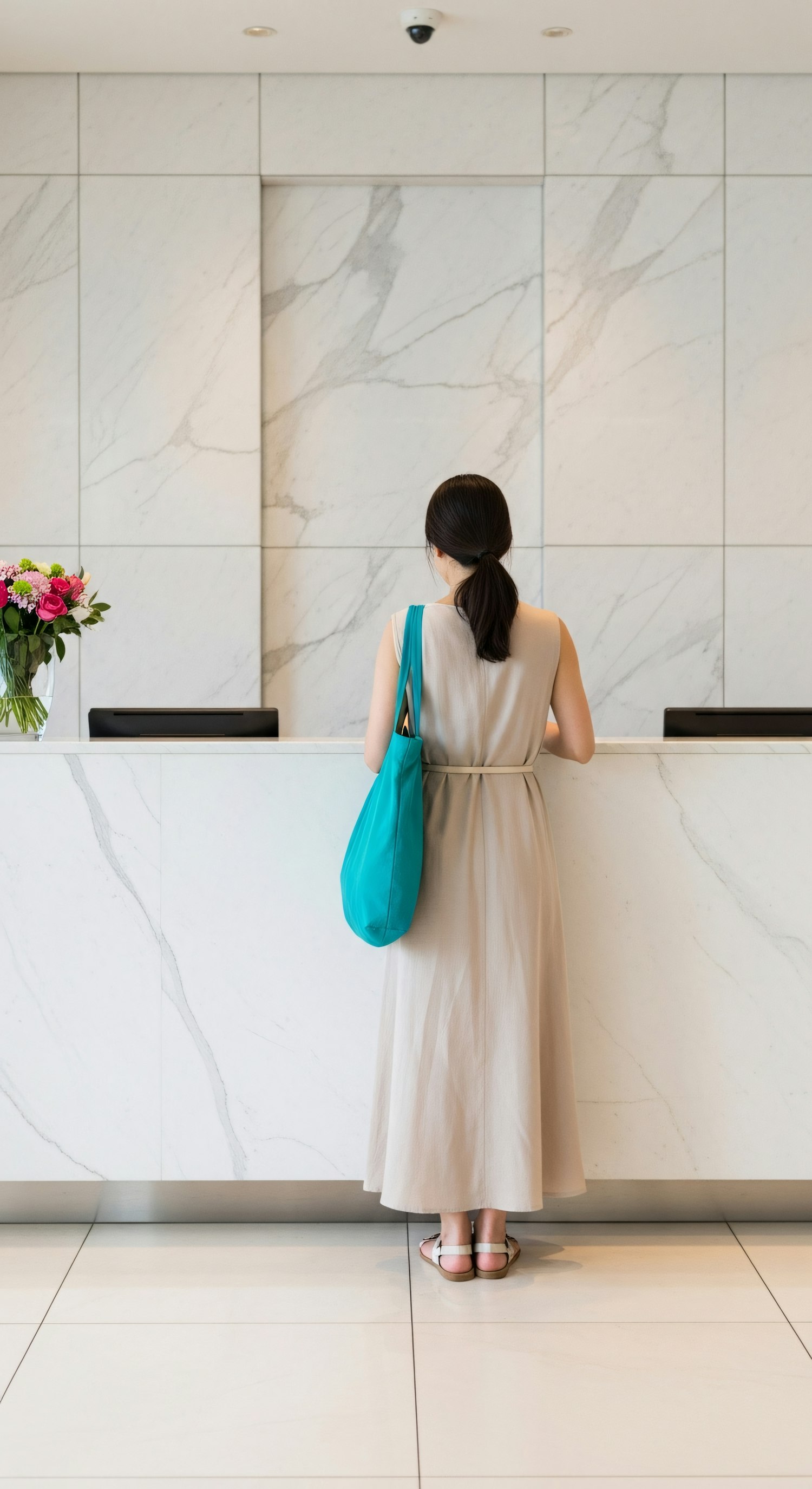 A woman in a beige dress with a turquoise bag stands at a modern marble reception desk, with flowers adding a pop of color.