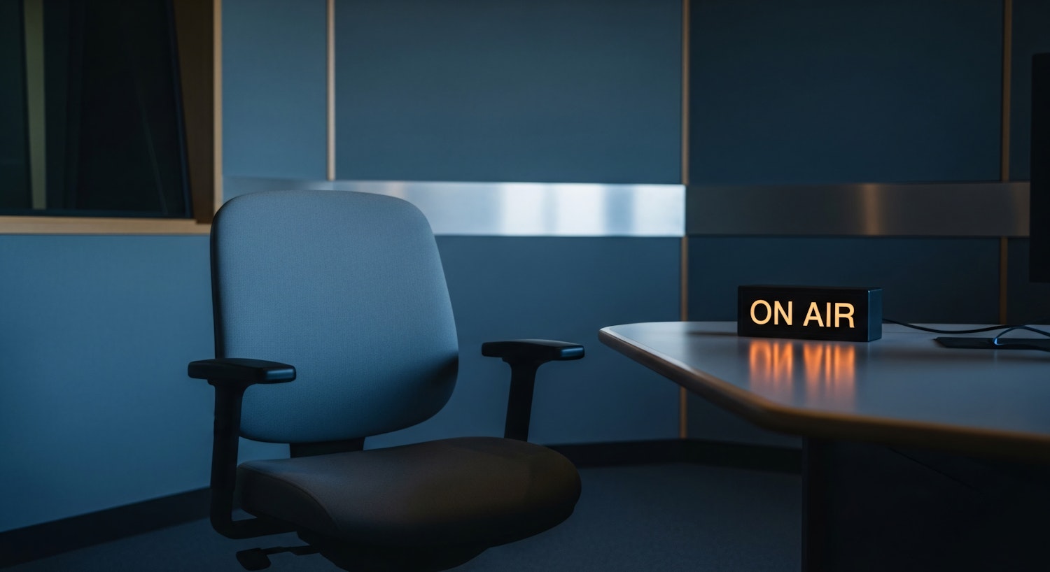 A professional studio setup with a glowing 'ON AIR' sign, a blue office chair, and soundproofed walls, perfect for recording or broadcasting.
