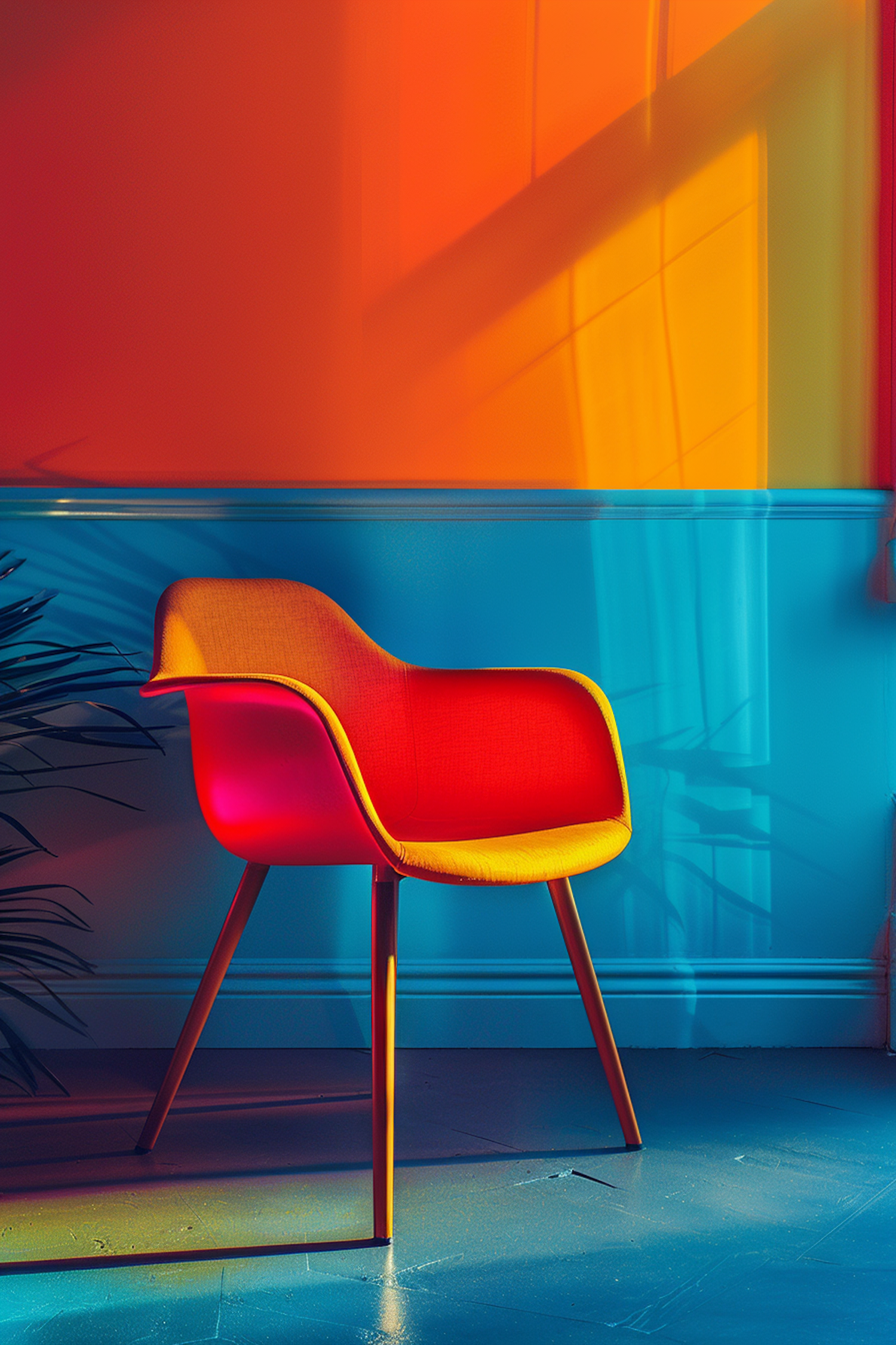 Vibrant red and yellow chair against a colorful orange and blue wall, with dynamic sunlight and shadows creating a bold visual impact.
