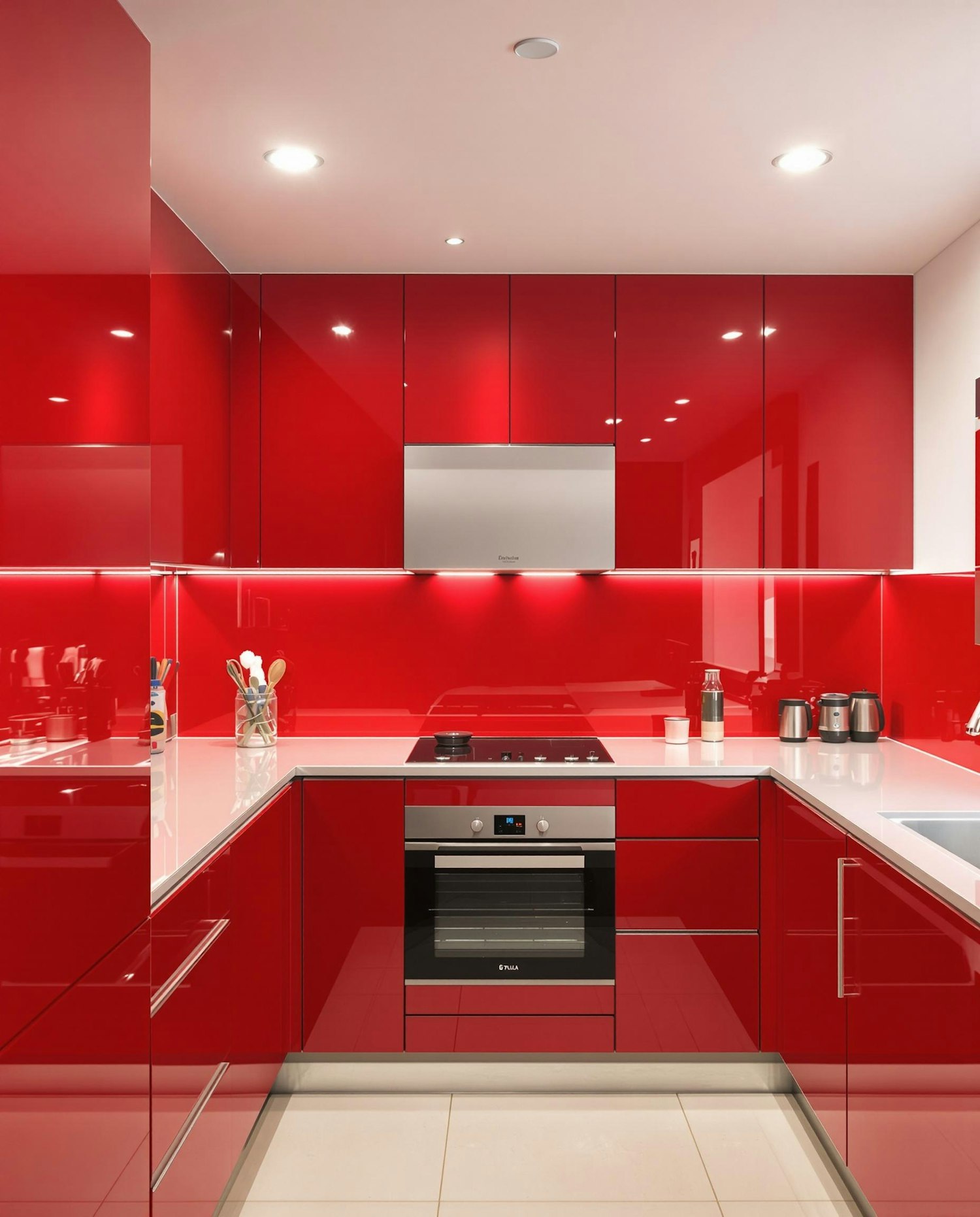 Sleek modern kitchen with glossy red cabinets, white countertops, and stainless steel appliances. Perfect blend of bold design and functionality.