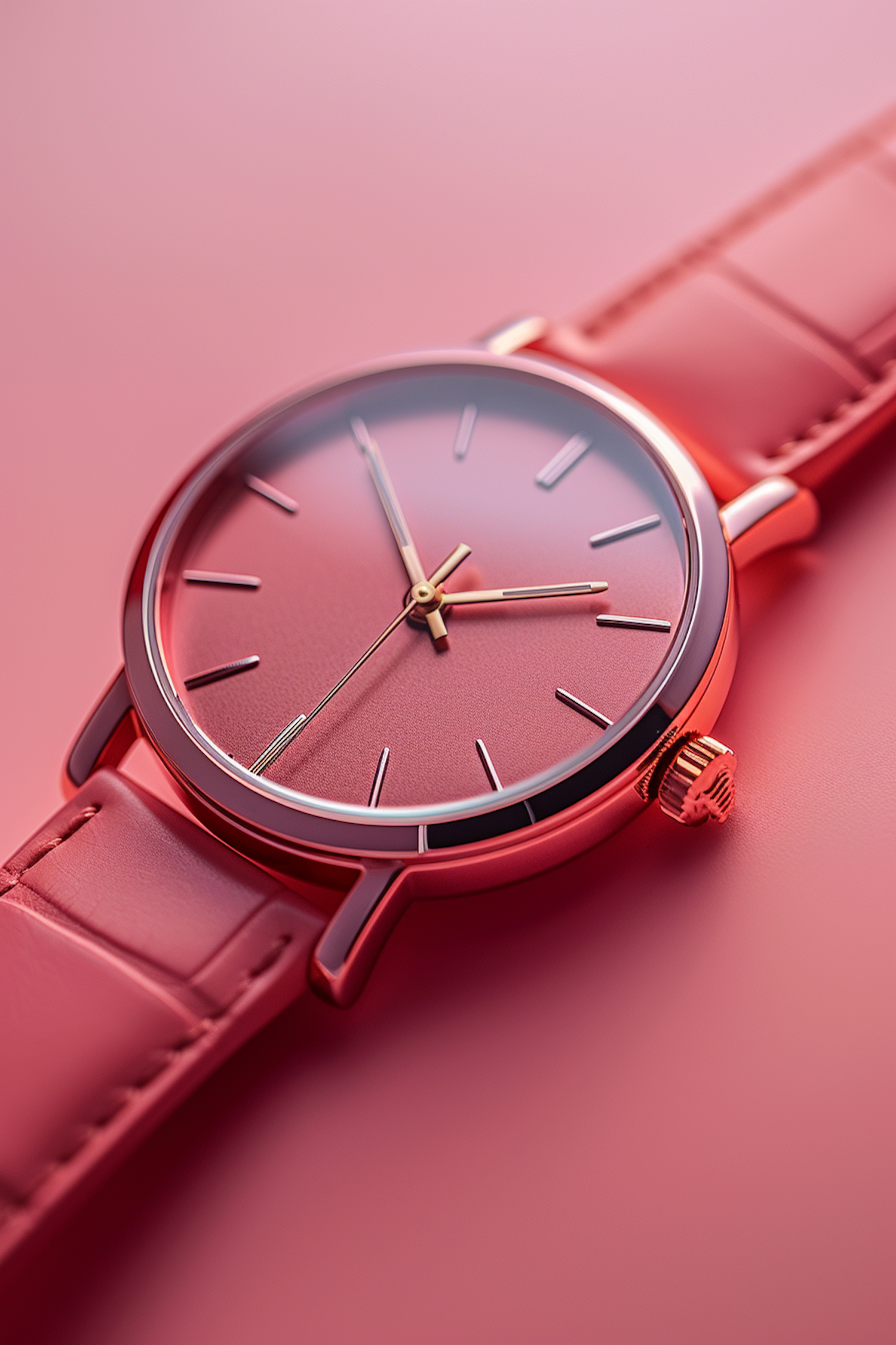 Elegant pink wristwatch with gold accents on a soft pink background, showcasing minimalist design and luxurious style.