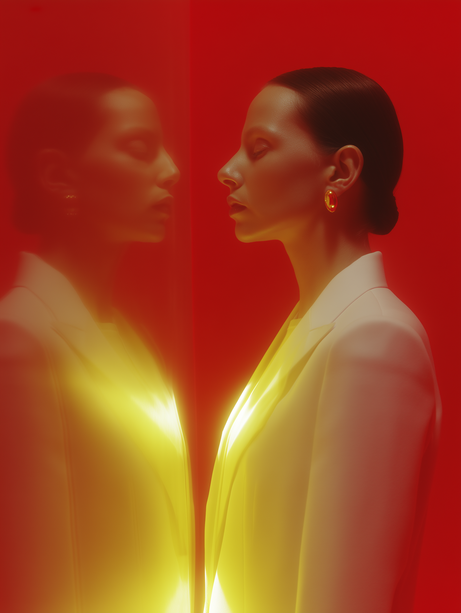 A striking artistic portrait of a woman in a white blazer, with a red background and glowing yellow light, creating a surreal mirrored effect.