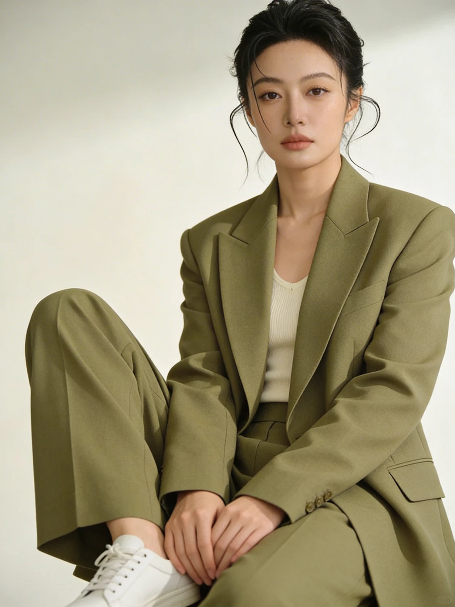 A woman in an olive-green suit and white sneakers sits in a relaxed pose against a neutral background, exuding modern elegance.