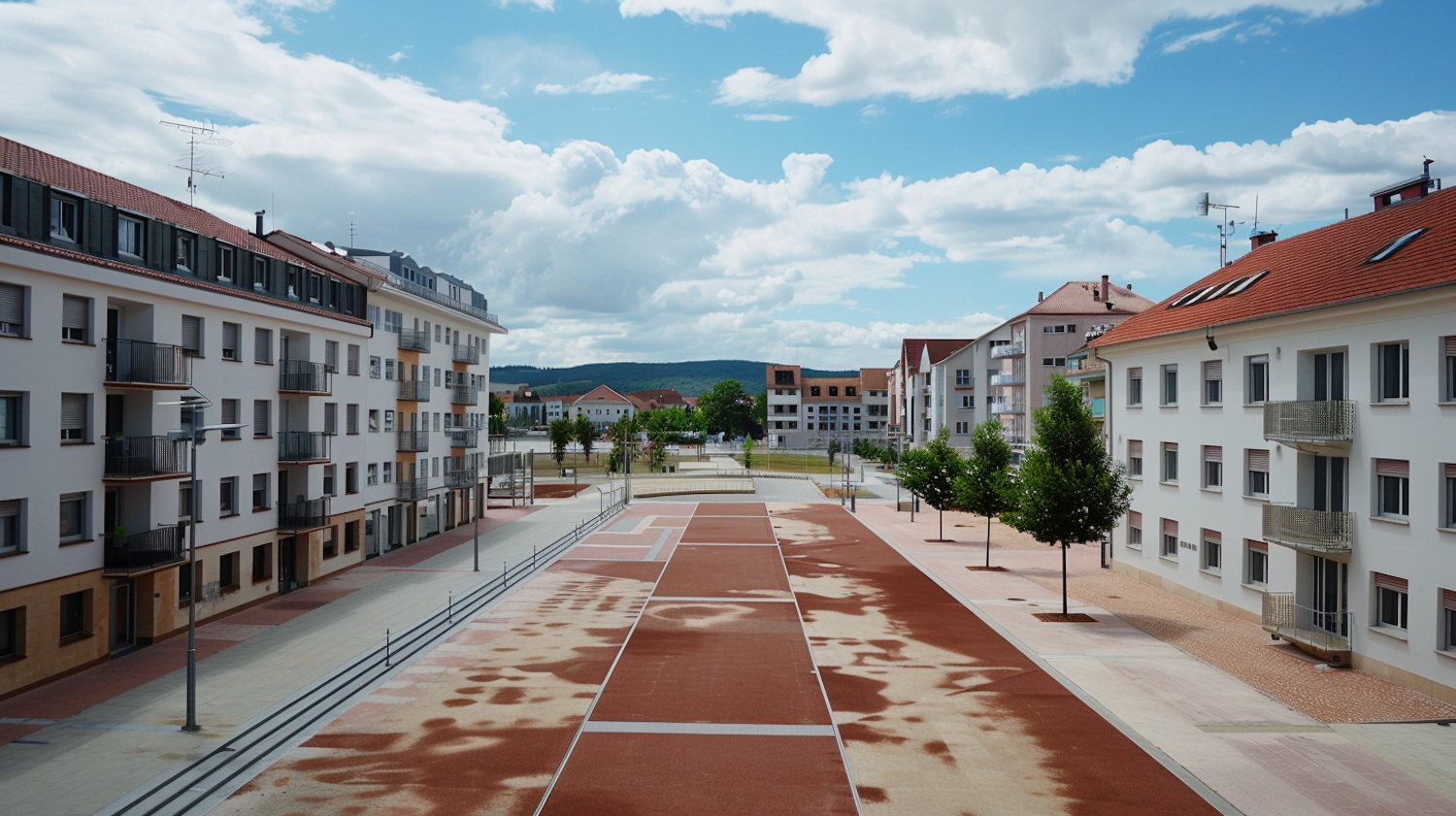Modern residential area with white buildings, red roofs, and a wide pedestrian walkway lined with trees under a blue sky.
