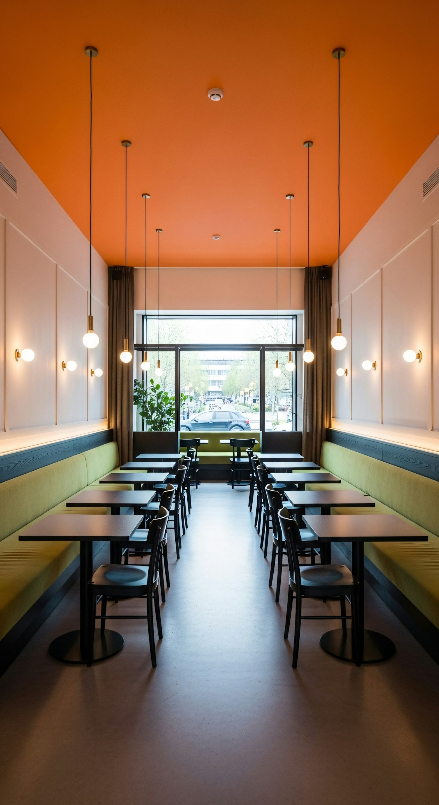 Modern restaurant interior with orange ceiling, green seating, and pendant lights, offering a cozy and stylish dining atmosphere.