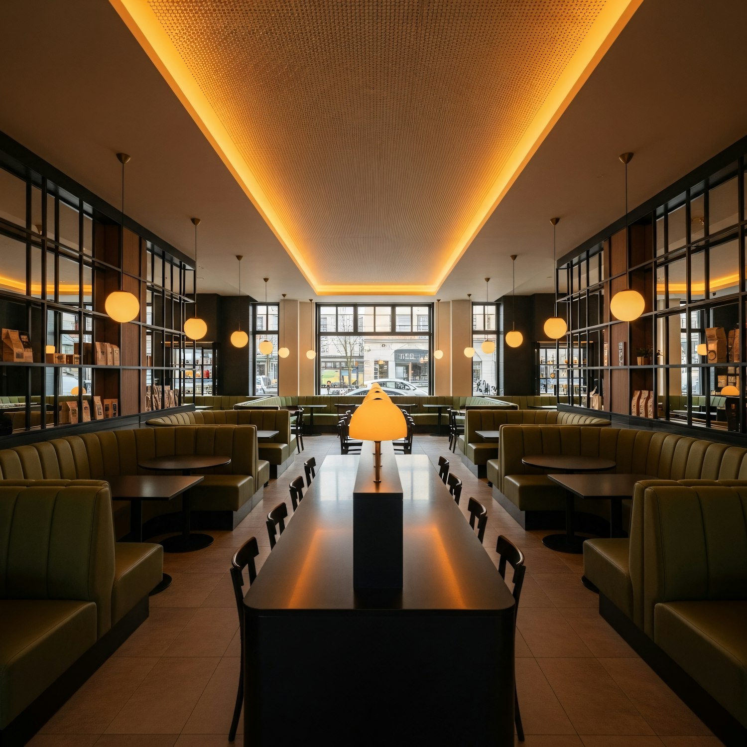 Modern restaurant interior with green booths, warm lighting, and a central communal table. Large windows bring in natural light.