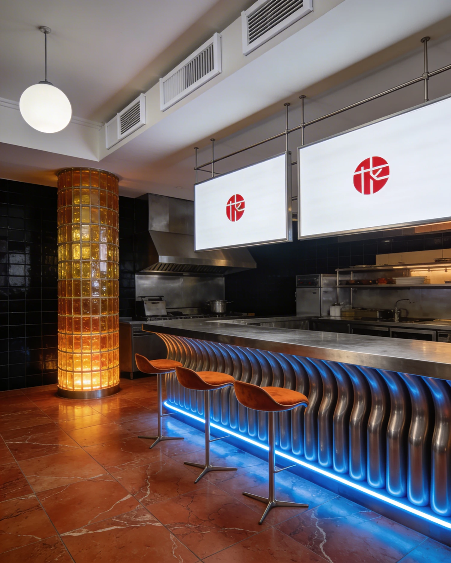 Three-quarter perspective interior shot taken from slightly to the right at standing eye level, looking diagonally into the space showing strong depth. White painted ceiling with exposed white painted rectangular ventilation ducts running horizontally along the top edge of the frame. A single round white globe pendant light hanging from the ceiling on the upper left. Floor is warm terracotta reddish-brown veined marble tiles with natural organic veining patterns. On the right side, a long organic wave-shaped bar counter with an undulating curved silhouette — the counter structure is made of smooth cylindrical brushed stainless steel columns arranged in a flowing wavy line, counter top is flat brushed stainless steel. A continuous blue neon light strip runs along the very base of the counter at floor level, casting a soft blue glow on the marble floor beneath. Three round bar stools in front of the counter — orange rust-colored round cushioned seats with low curved backrests, mounted on thin brushed stainless steel legs and frames, mid-century modern style. Far left background: a tall floor-to-ceiling cylindrical column made of stacked amber golden glass bricks glowing warmly. Dark charcoal black tiled walls visible on the left and behind. Stainless steel kitchen hood and equipment visible behind the counter in the background. Two large white rectangular menu boards suspended from the ceiling by thin metal rods in the upper portion of the frame — replace all text on the boards with the reference logo in vivid red, centered on each white board. Warm ambient lighting, soft and moody. Photorealistic, 28mm wide angle lens, commercial interior architectural photography.