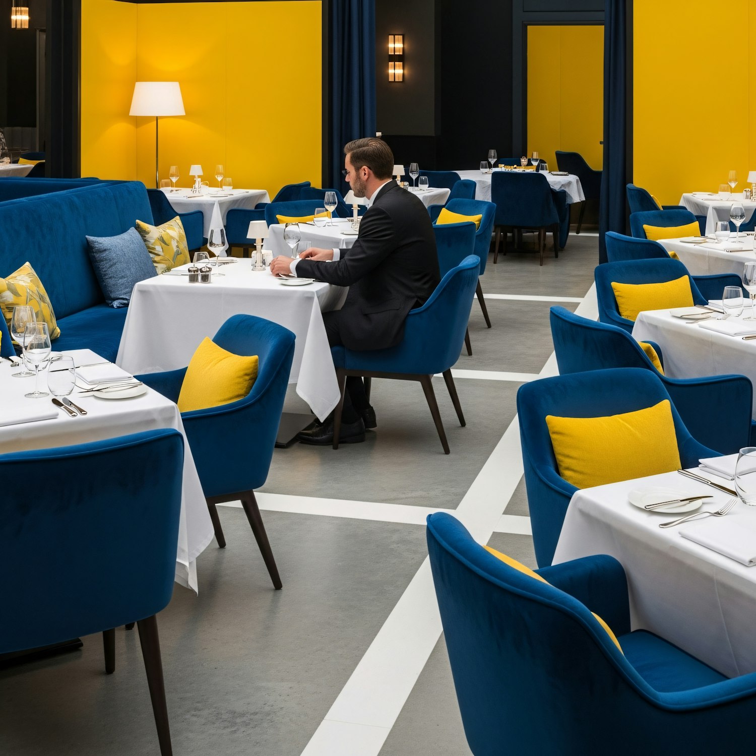 Elegant restaurant interior with blue and yellow decor, white tablecloths, and a modern ambiance. A man in a suit dines alone.