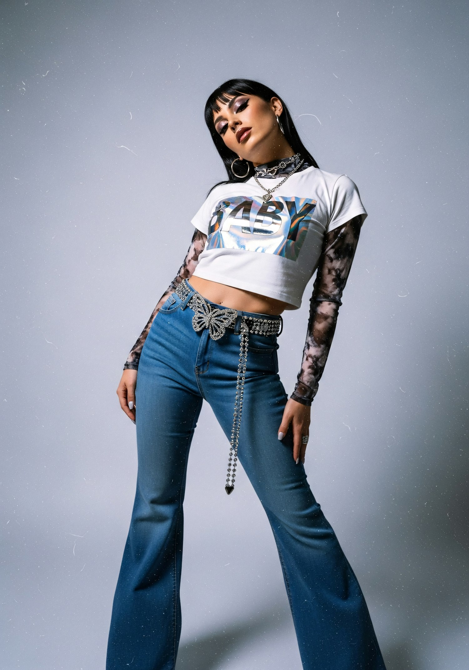 A fashionable person in a bold outfit with a crop top, flared jeans, and statement accessories, posing against a neutral background.