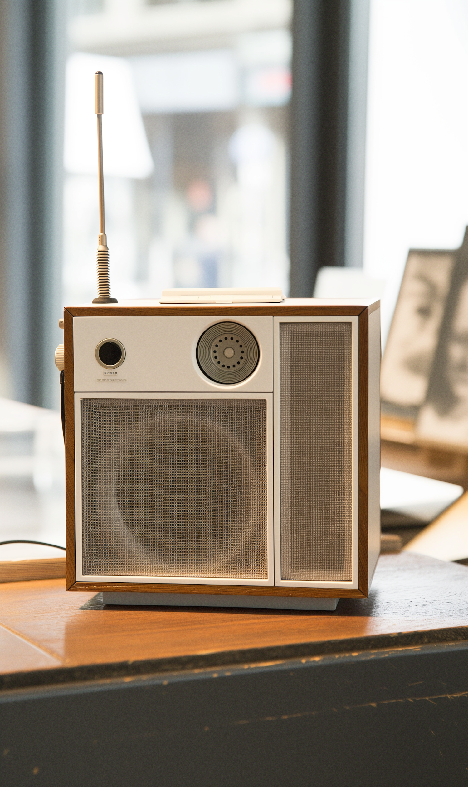 Vintage-style radio with wooden frame and white panel, featuring a large speaker grille and antenna, set on a wooden surface.